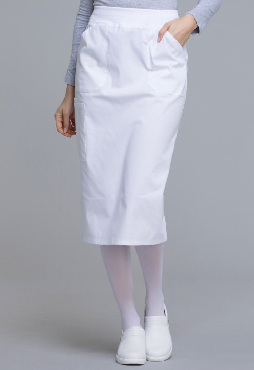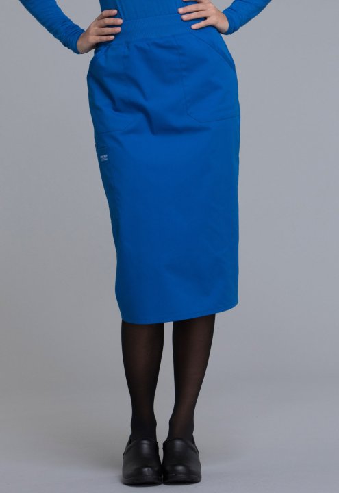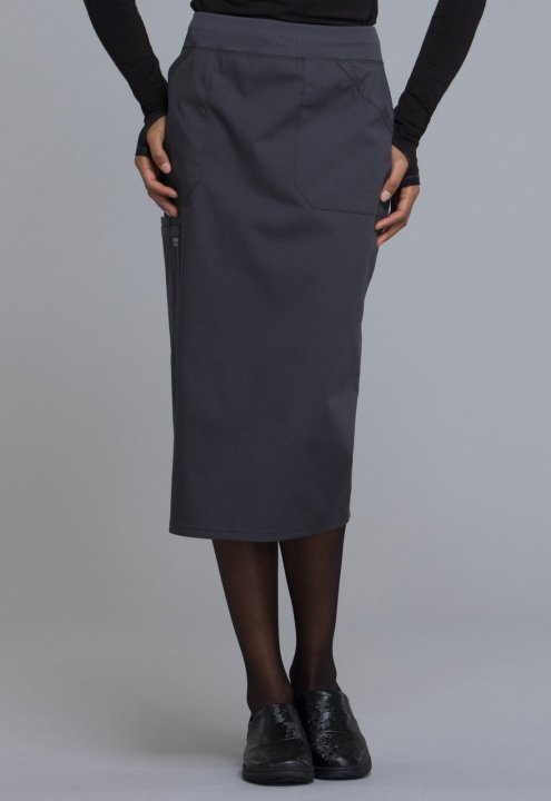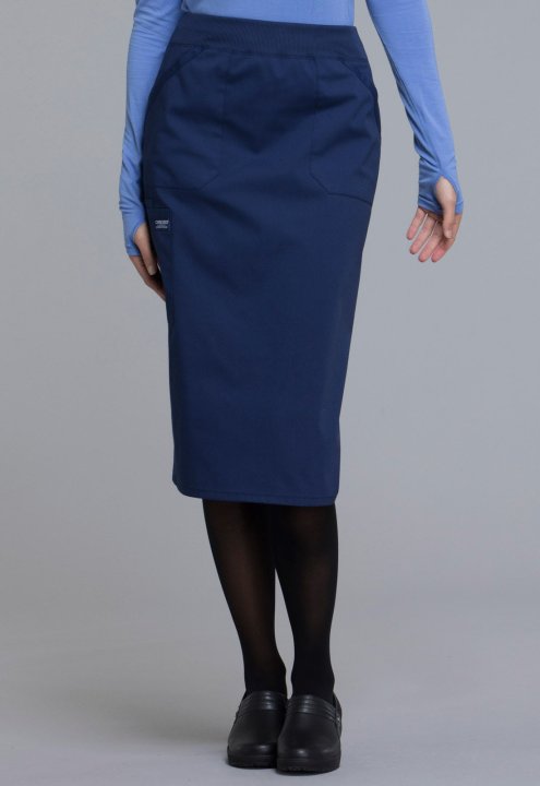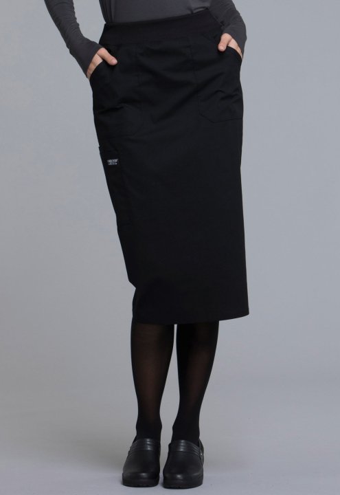 A Modern Classic fit skirt features a comfort-fit rib knit waistband reinforced with inside elastic, front patch pockets, and a large cargo pocket with pen stitch. Also features a cell pocket and a back vent for easy movement. Center back length: 30