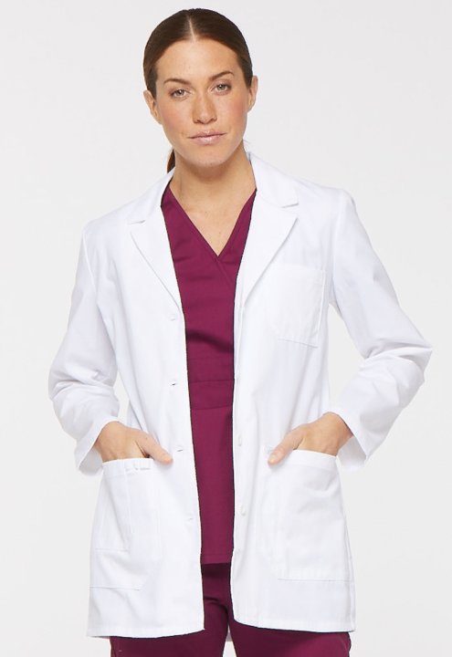 A Contemporary fit button front lab coat features a notched lapel and two chest pockets, including one inside for extra storage. Also featured are two roomy patch pockets one with an extra cell phone pocket and utility loop, the other with a pencil slot.