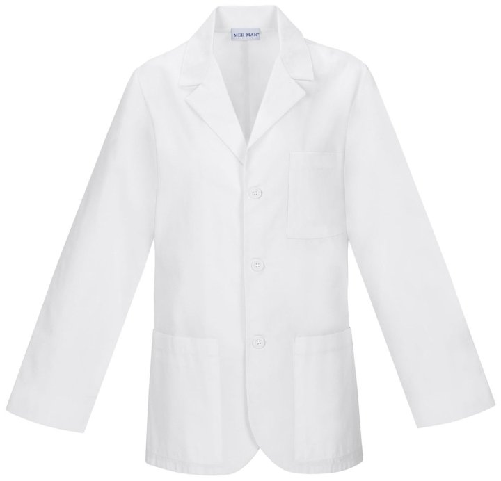 A men's 31" twill consultation lab coat features a vented back and notched lapel. This multi pocket lab includes three outside pockets and three inside pockets.