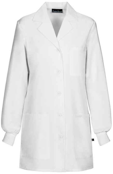 A Traditional Classic fit, stylish 32" lab coat features a notched lapel, two patch pockets, a chest pocket and a button back belt detail for shape, side vents, and knit cuffs.