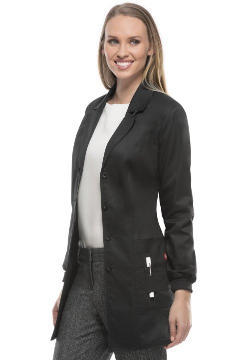 A Contemporary fit button front lab coat features a notched lapel, rib knit cuffs and princess seams to add shape. Also featured area bungee loop on the collar, four patch pockets (one with a functional snap closure for extra security) and pen slots. Cent