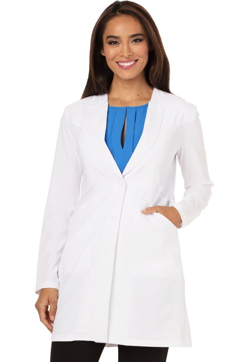A Contemporary fit, notched lapel lab coat features a four-button closure, front-and-back side contour panels and princess seams to add shape. Also featured are angled slit pockets with contrast interior pockets, and an exterior logo charm. Center back le