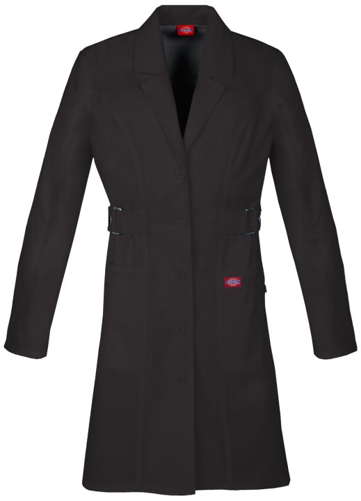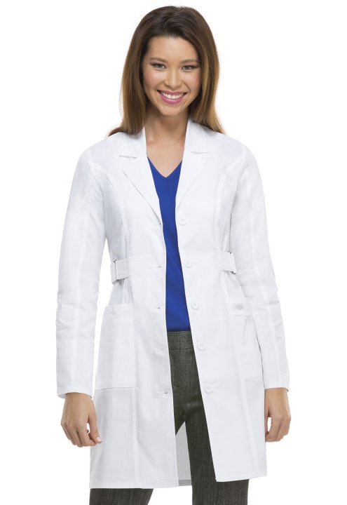 A Contemporary fit button front lab coat features a notched lapel, multi needle topstitching, front and back princess seams, a back yoke, a cell phone pocket, multi sectional utility slots, two roomy patch pockets, an I.D. bungee loop and side belts that