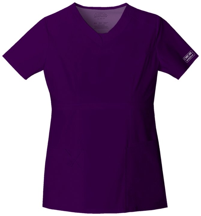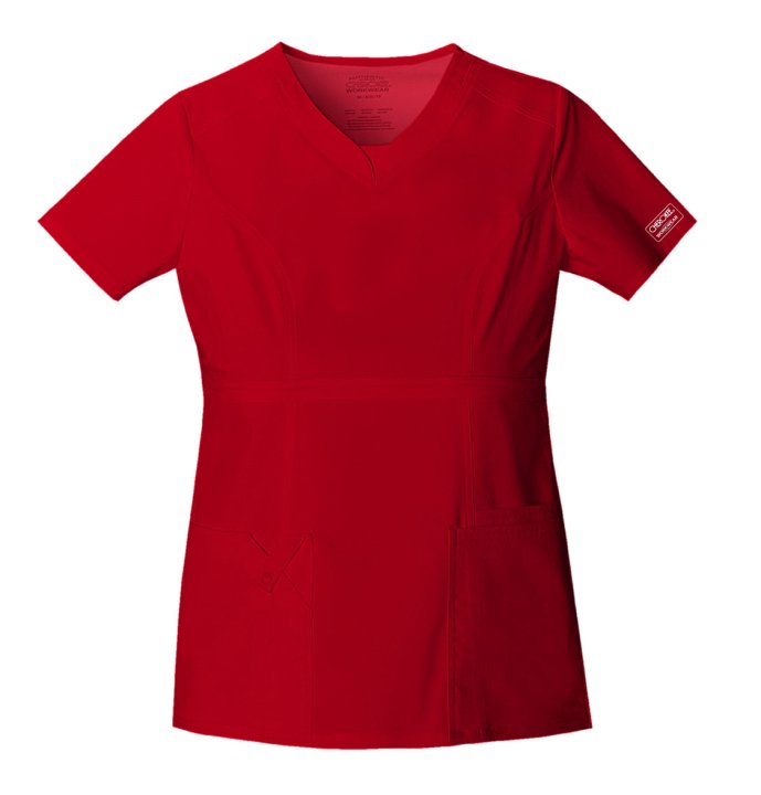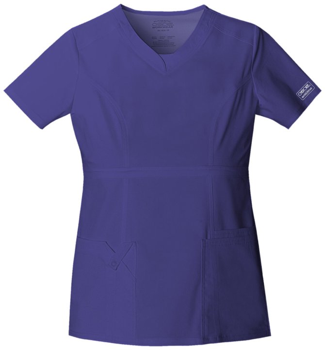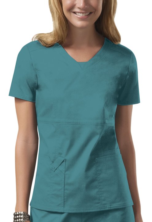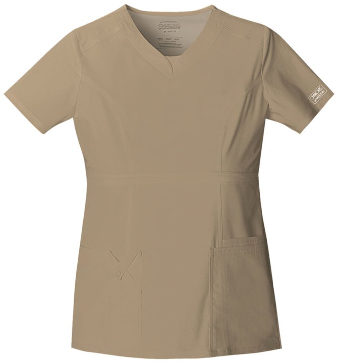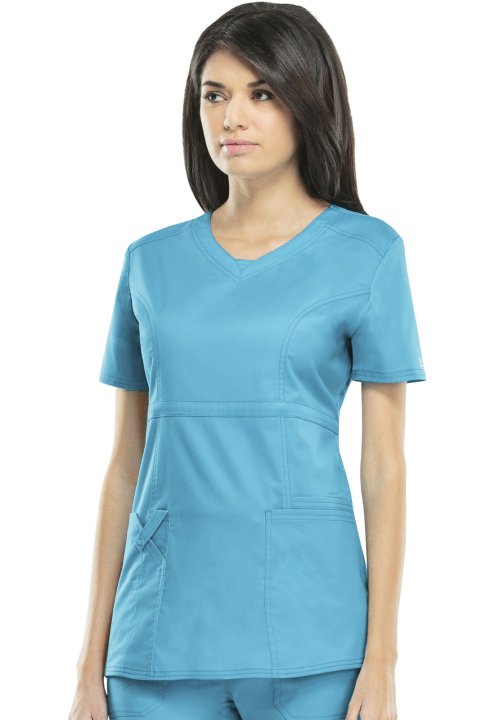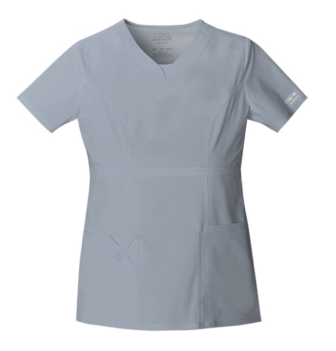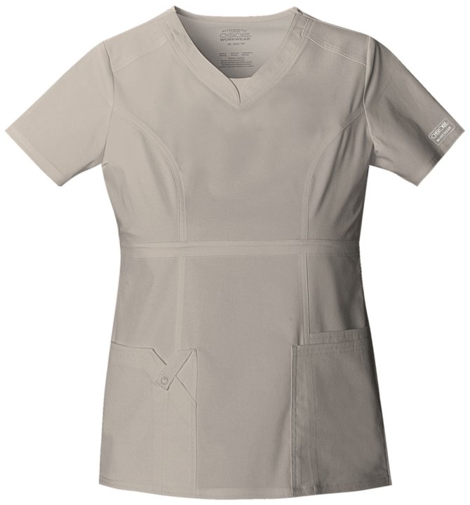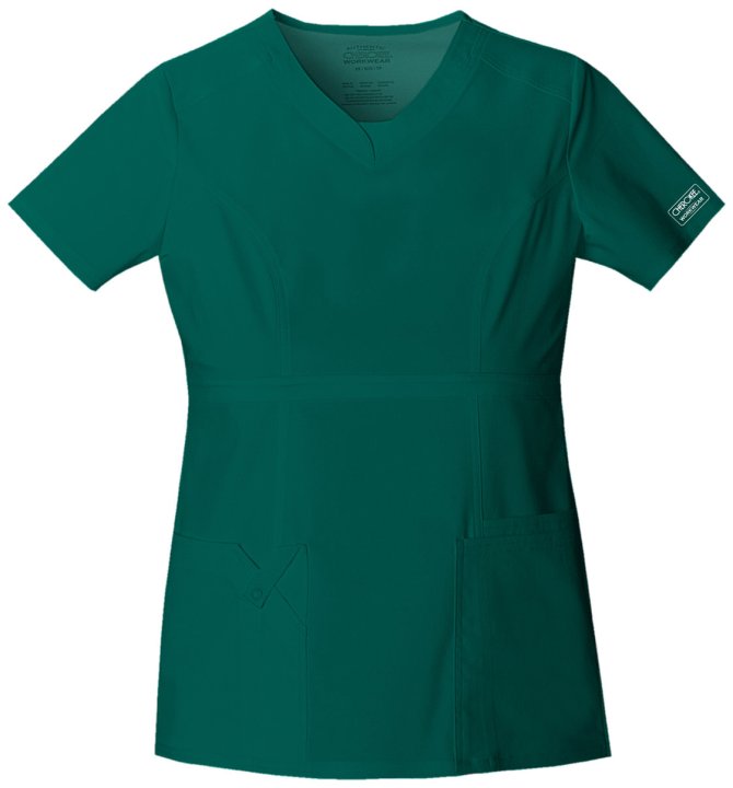 A Contemporary fit empire top features rounded V-neckband with a dickie inset, yoke panels, front and back princess seams. It also features multiple patch pockets; wearer's right has stylized double pocket with twill tape loop and left has an additional c