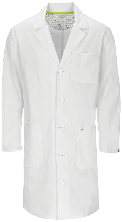 A 38" Unisex button front lab coat features a notched collar, chest pocket with a pencil stitch, two lower patch pockets with side entry access to the pant pockets, and an instrument loop with logo D-ring above the right pocket. Also featured are back ple