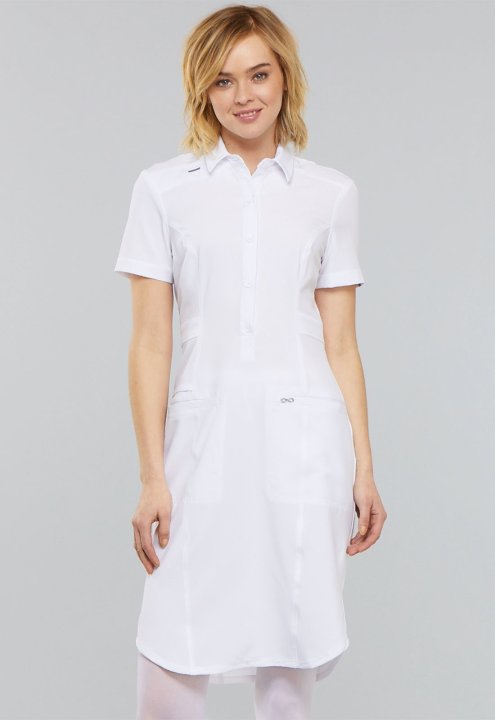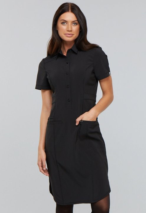Our shirt collar dress features front and back princess seams and a set-in waistband for a more tailored look. Additional design details include a button front placket, front welt pockets, a bungee ID badge loop, an instrument loop, and a shirttail hem wi