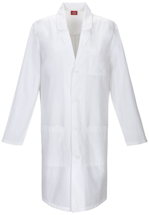 Unisex Fit lab coat features a notched collar and a four button front closure. Also featured are one chest pocket and two lower patch pockets with side entry for easy access to pant pockets. A back yoke and kick pleat complete this coat. Center back lengt