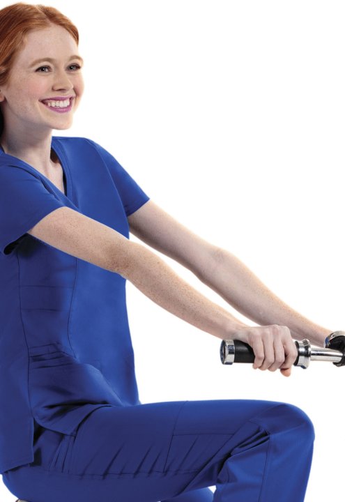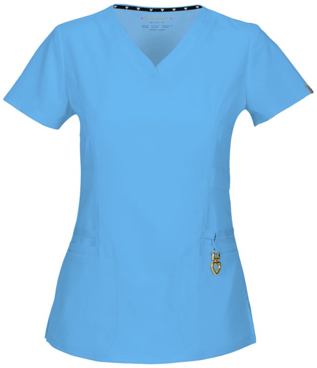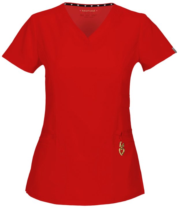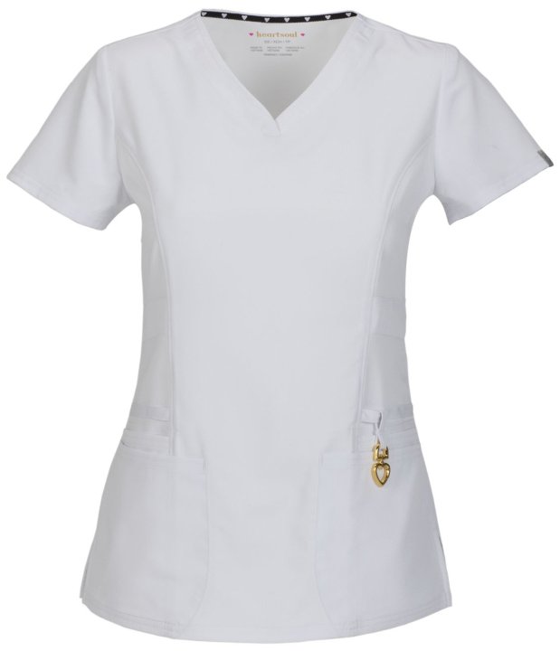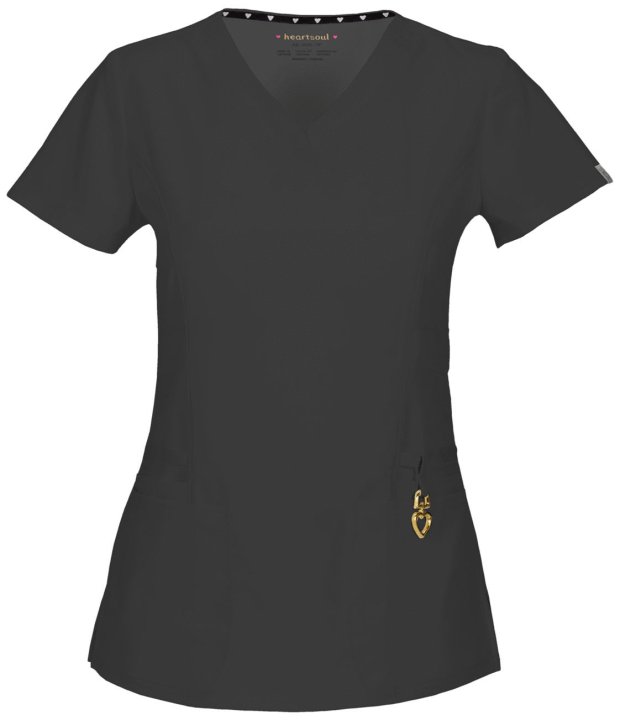 A Contemporary fit V-neck top features rounded patch pockets, interior pockets, utility loops, HeartSoul signature black and white woven neck tape, front and back princess seams and an easy to remove HeartSoul logo carabiner. Center back length: 25 1/2"