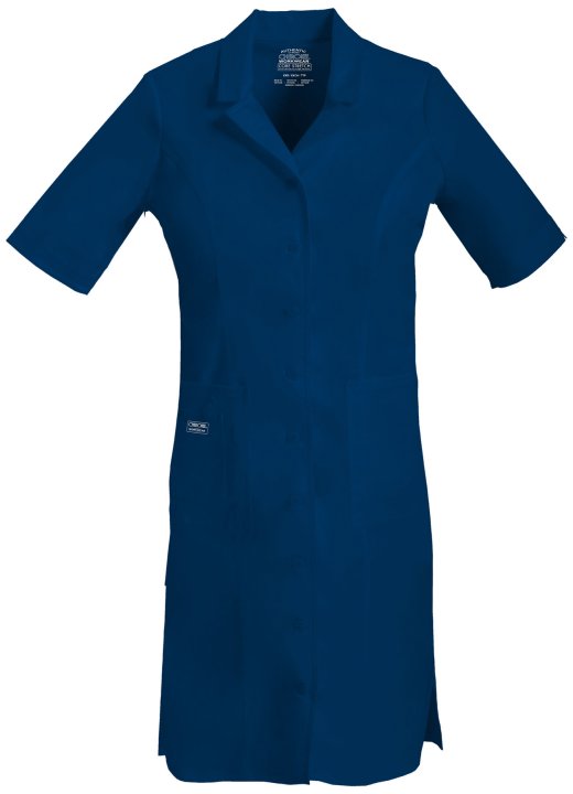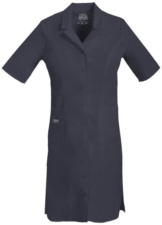 This Modern Classic fit, professional scrub dress features a notched collar and lapel, a button front closure, elbow length sleeves that can be worn folded up or down, along with three patch pockets; the right pocket has extra cell phone pocket and I.D. l