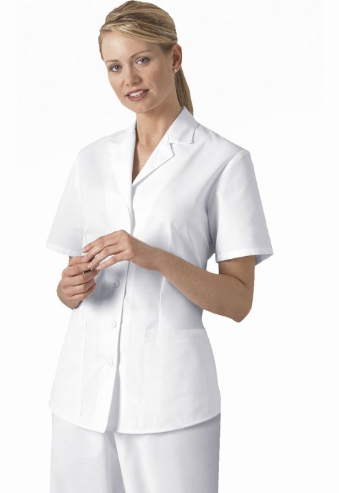Great for the healthcare professional or for the medical student, this Traditional Classic fit, button front twill top features a lapel collar, two roomy patch pockets and a shirttail hem. The back has a stitched belt that secures three pleats for shape.