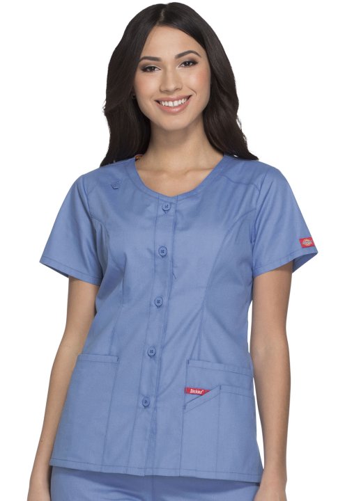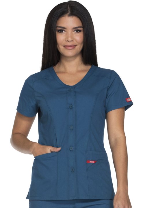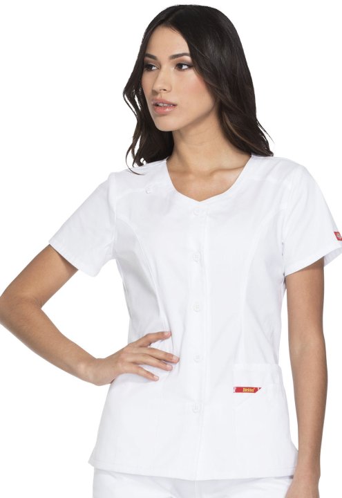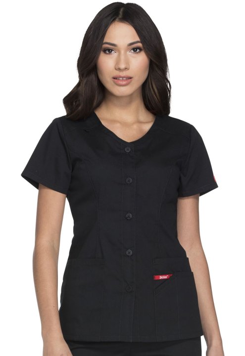 A Modern Classic fit V-neck top features a five-button closure and patch pockets, the right with a Red stretch knit interior pocket (White knit pocket on White), the left with a utility loop. Also featured are Dickies logo twill tape along the back neck,
