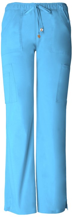 A Contemporary fit, low rise, straight leg pant features an all around elastic waist, an adjustable drawstring with gold heart shaped logo charms at the tips and a printed facing inside the waistband. Also featured are front pockets, double needle topsti