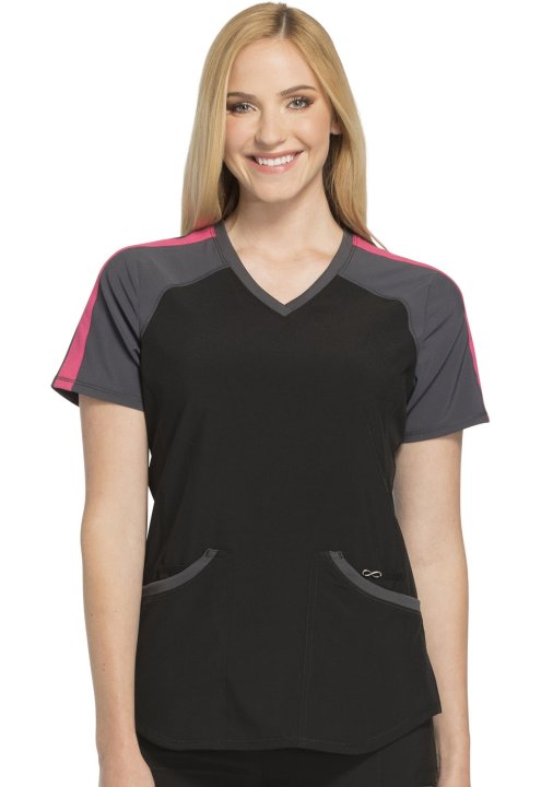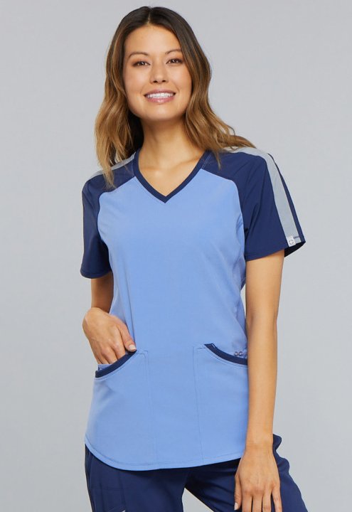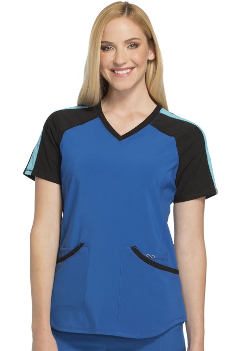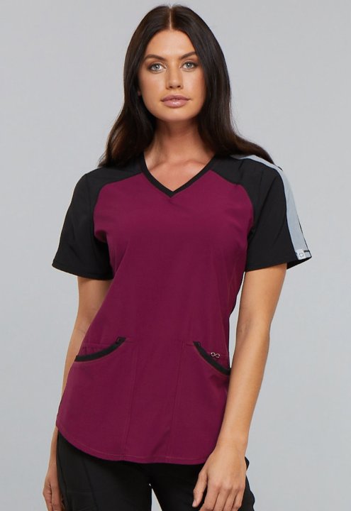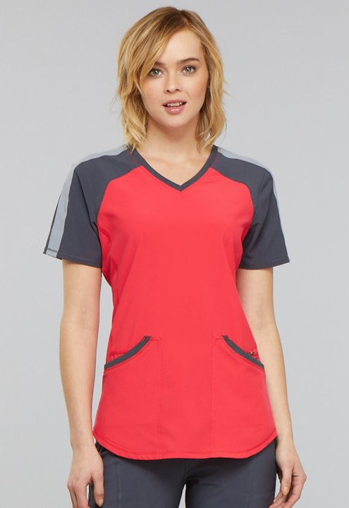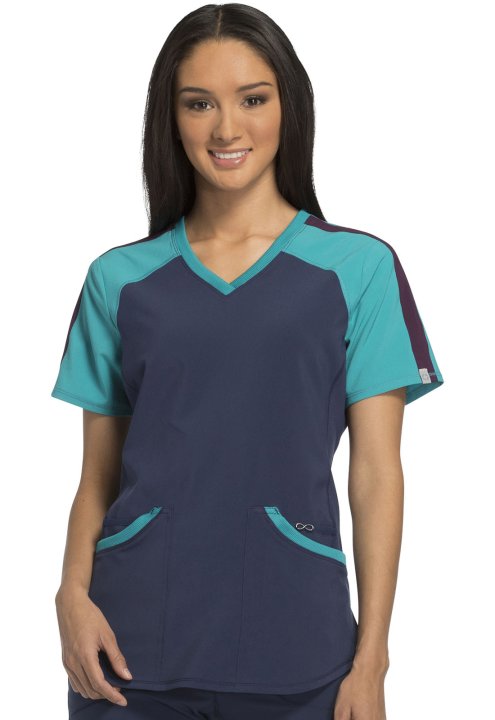 A Contemporary fit, colorblock V-neck top features a rib-knit neckband, two patch pockets with interior pockets and rib binding, and a signature logo charm. Also featured are front and back shoulder yokes, front and back princess seams, a shirttail hem, s