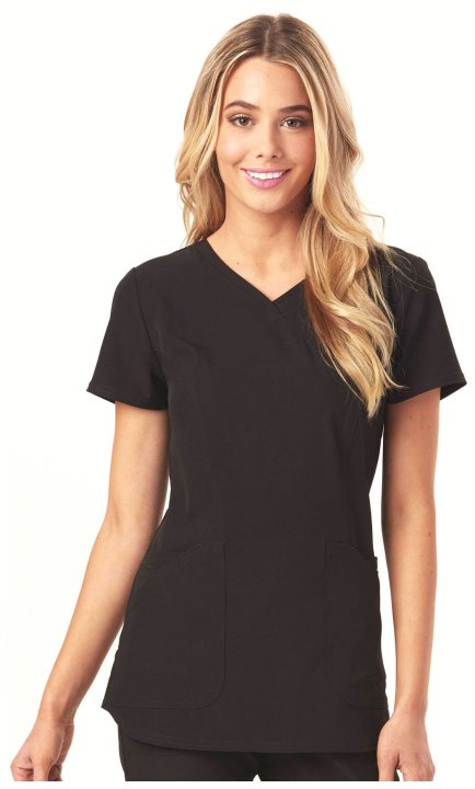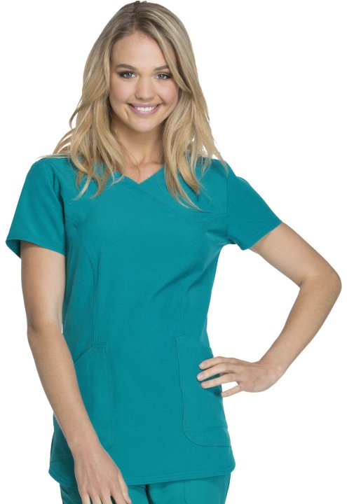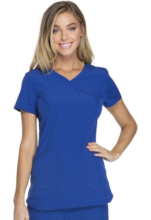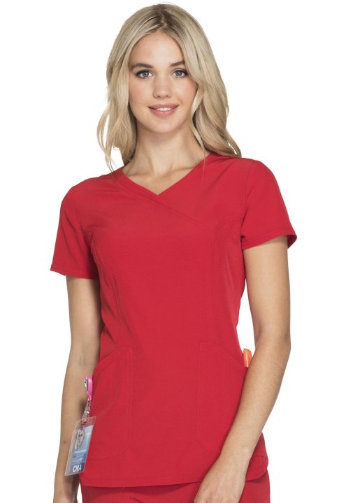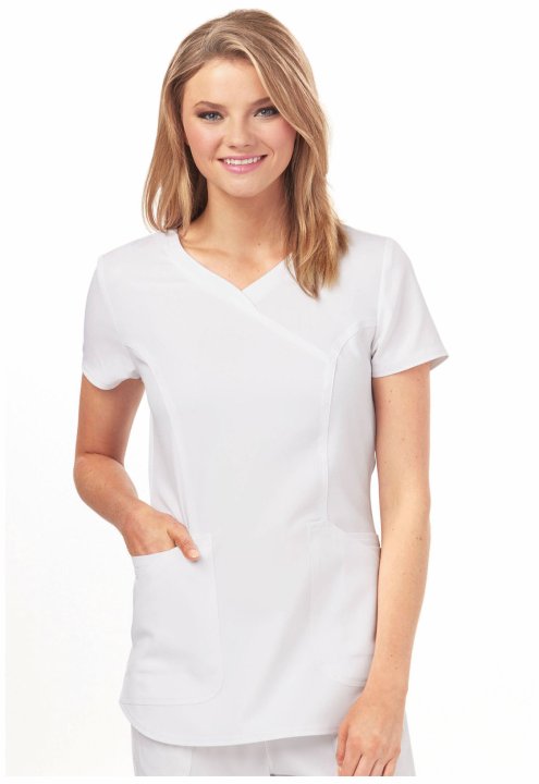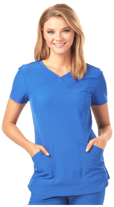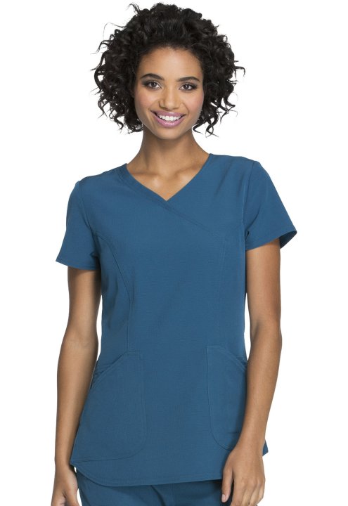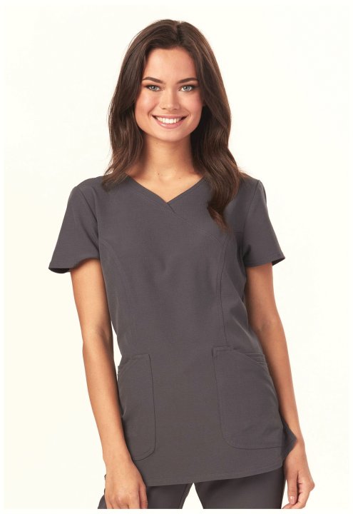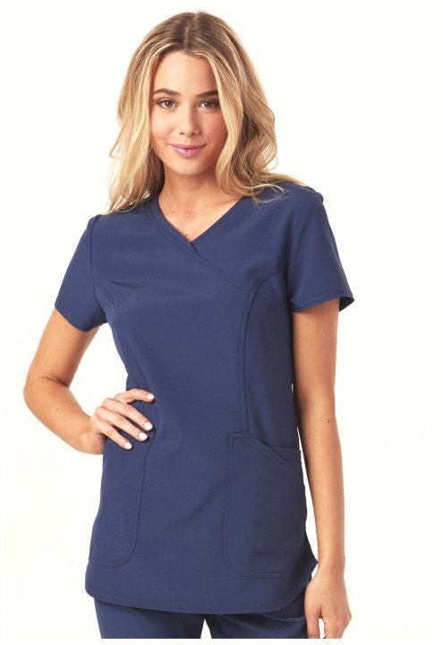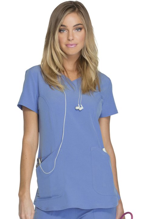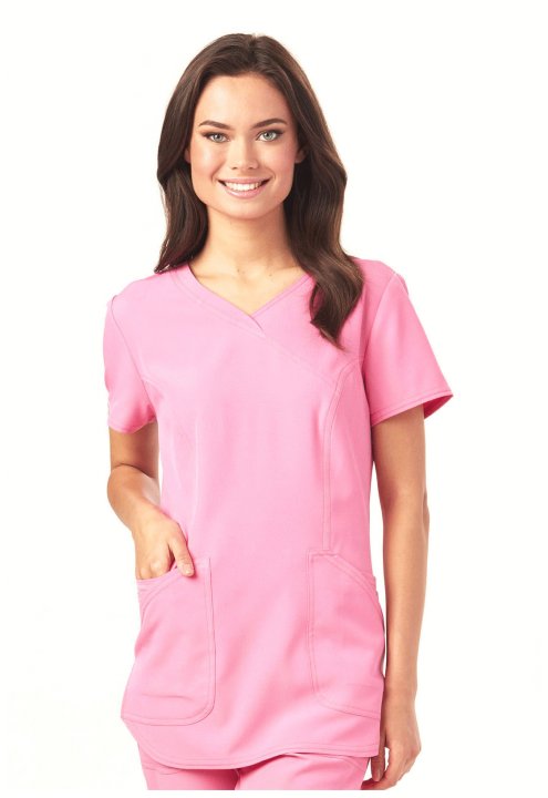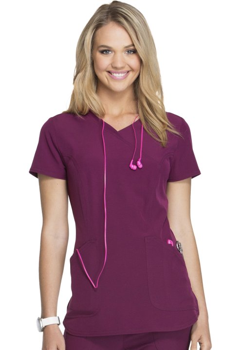 A Contemporary fit mock wrap features a V-neckline, angled patch pockets with small interior pockets, a hidden pink grommet and bungee loop for headphone cable management. Also featured are double-needle topstitching, signature woven tape at the back neck