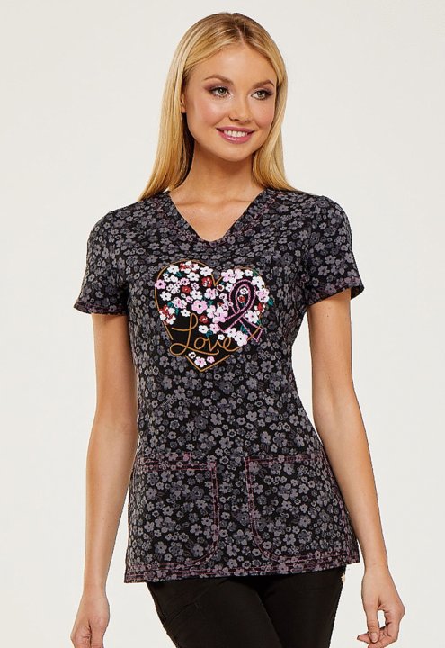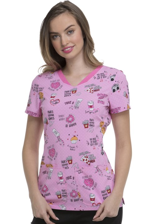 This shaped V-neck top features a contrast neckband, rounded patch pockets with a small interior pocket on the wearer's right, and our signature woven tape along the back neckline. Additional design details include double-needle topstitching throughtout,