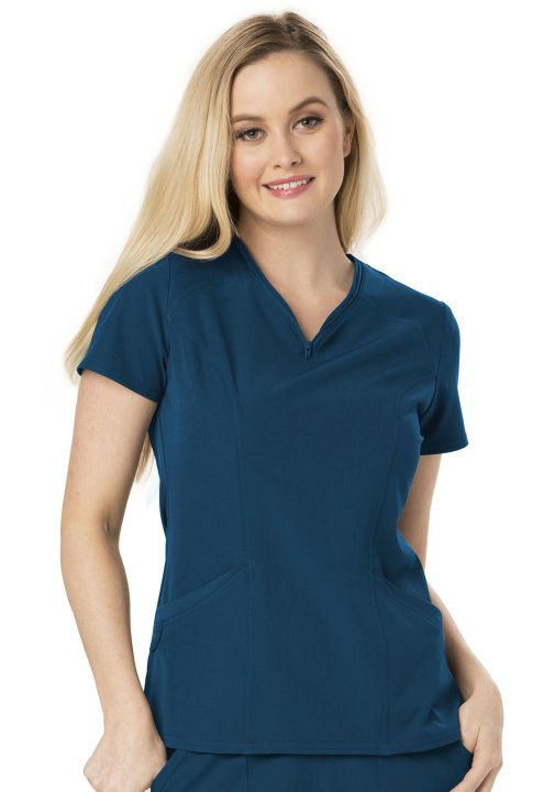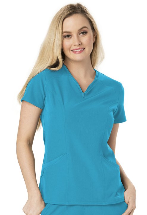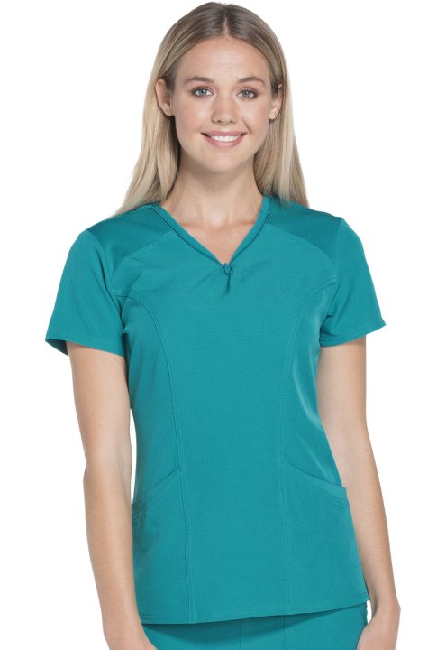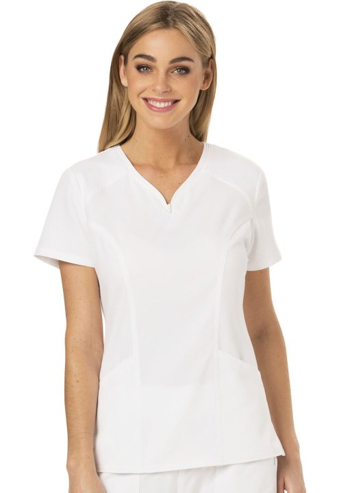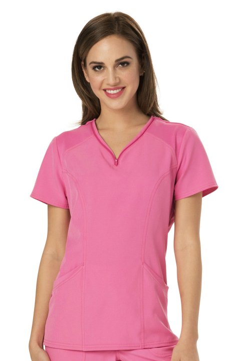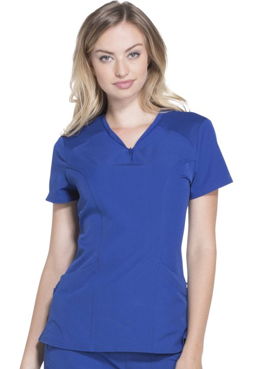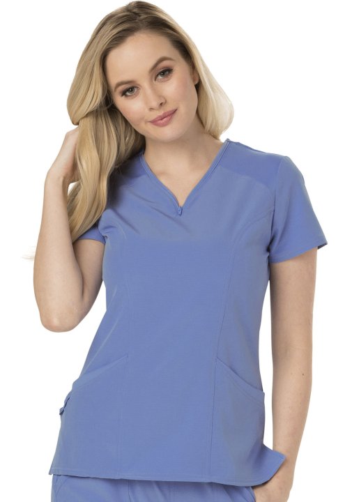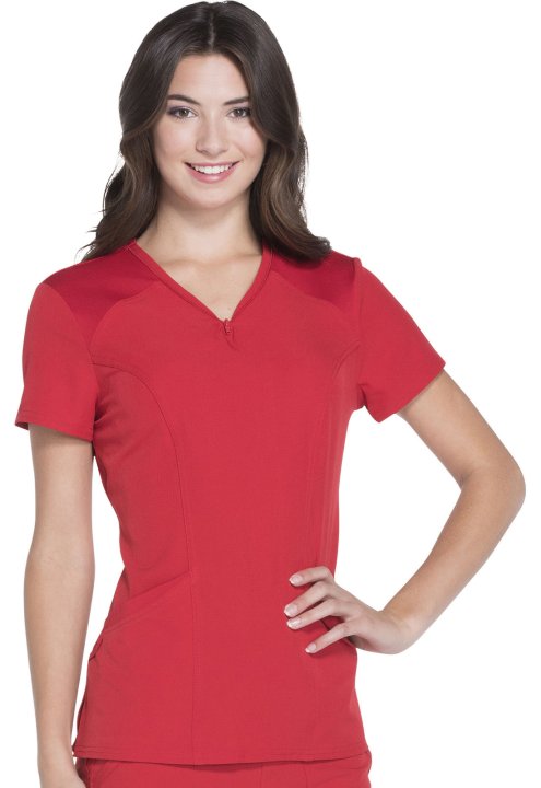 A Contemporary fit V-neck top features zipper detail at the neckline, rib-knit yokes and back panel, signature triple-heart and dotted-heart heat transfers, and side vents with heart grommet detail. Also featured are rounded patch pockets, front princess