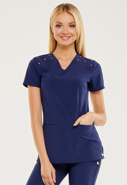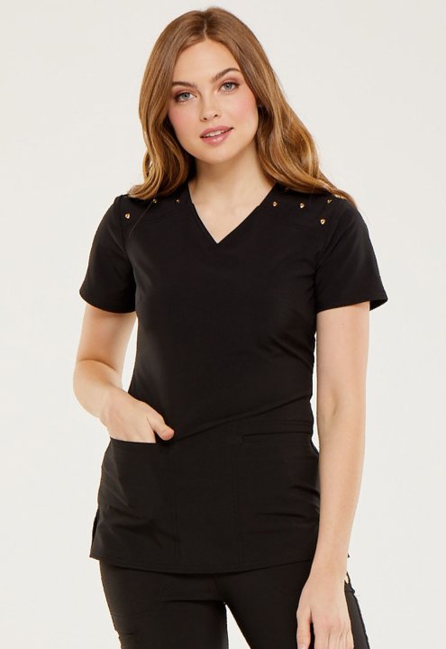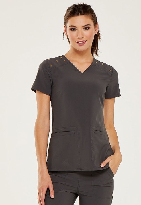 This chic V-neck top features heart grommet embellished shoulder panels, half-welt pockets, a signature heart charm, and a small hidden interior pocket with a metallic heat transfer. Additional design details include our signature printed back neck trim,