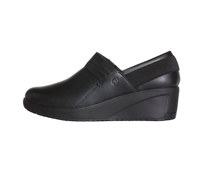 Oil & Slip Resistant rubber outsole. Multi Layered open cell Ortholite Insole provides exceptional support and breathability. The top layer is Impressions that conforms to the foot.Insole is removable for use with Orthotics. Genuine Leather slip-on upper.