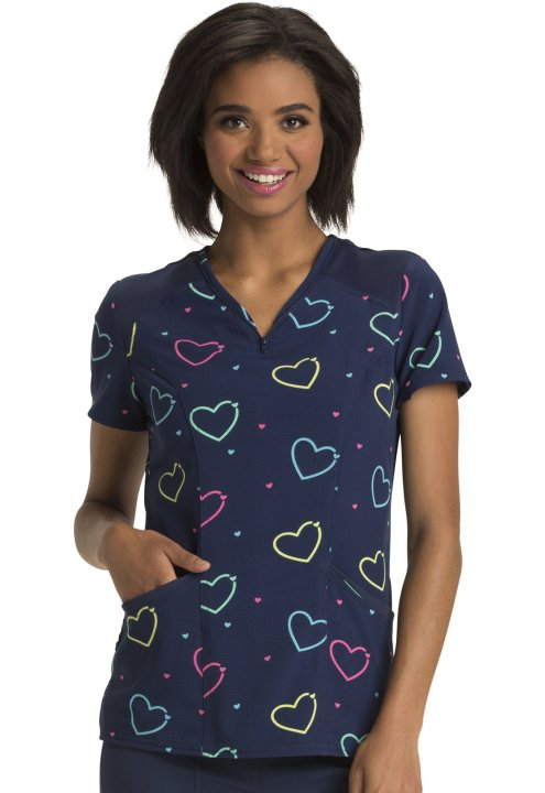 A Contemporary fit V-neck top features zipper detail at the neckline, rib-knit yokes and back panel, signature triple-heart and dotted-heart heat transfers, and side vents with heart grommet detail. Also featured are rounded patch pockets, front princess