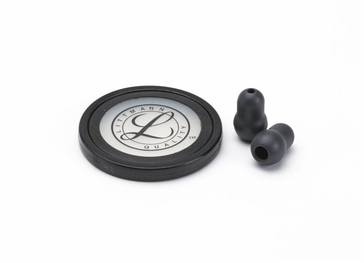 3M Littmann Stethoscope Spare Parts Kit for the Master Cardiology Stethoscope contains a black rim and tunable diaphragm for chestpiece, in addition to two small (1/2 inch), black Snap Tight Soft-Sealing Eartips.