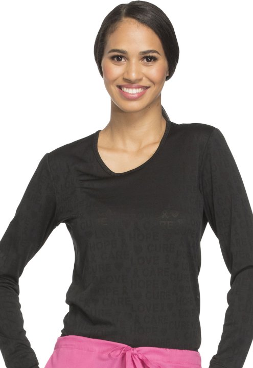 A Modern Classic fit, long sleeve underscrub knit tee features a delicate pointelle pattern of the encouraging words "cure, care and love." Also featured is an embroidered breast cancer awareness ribbon-heart on the left cuff. Center back length: 26"