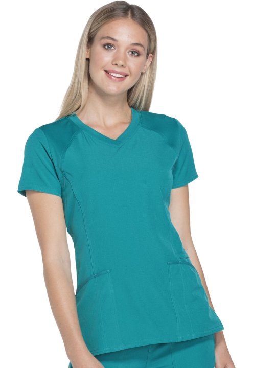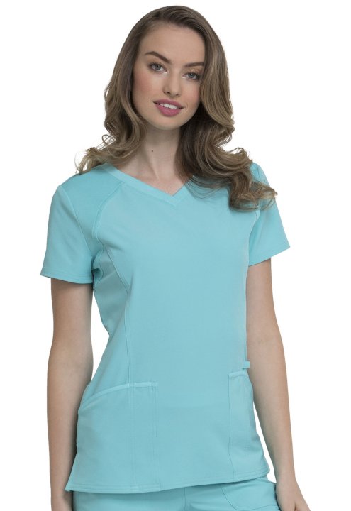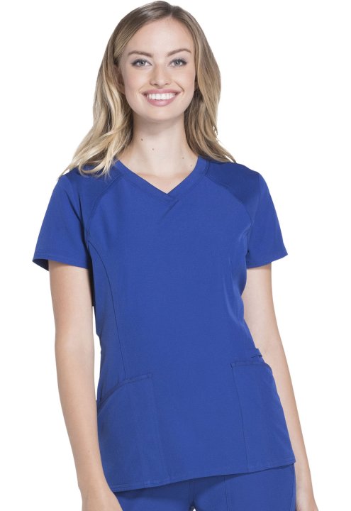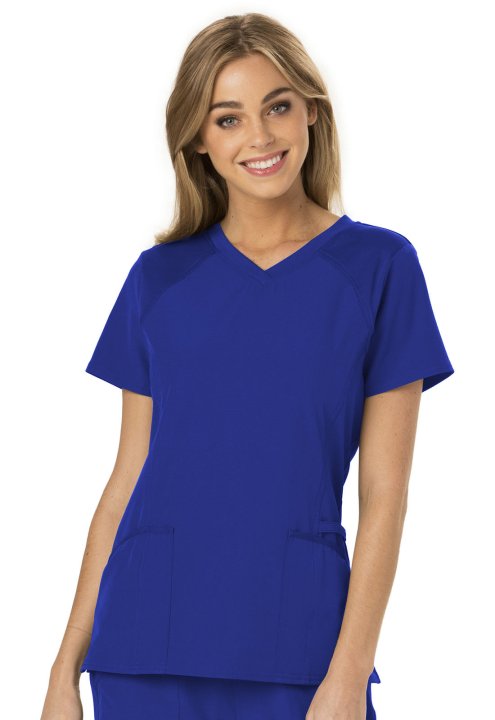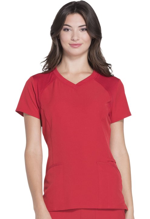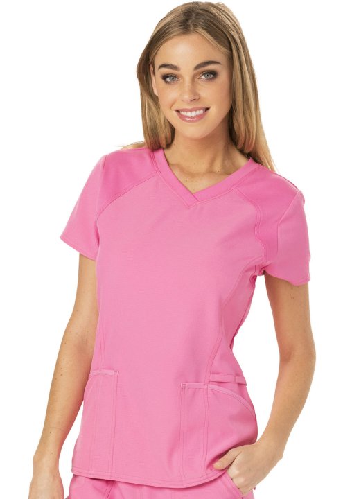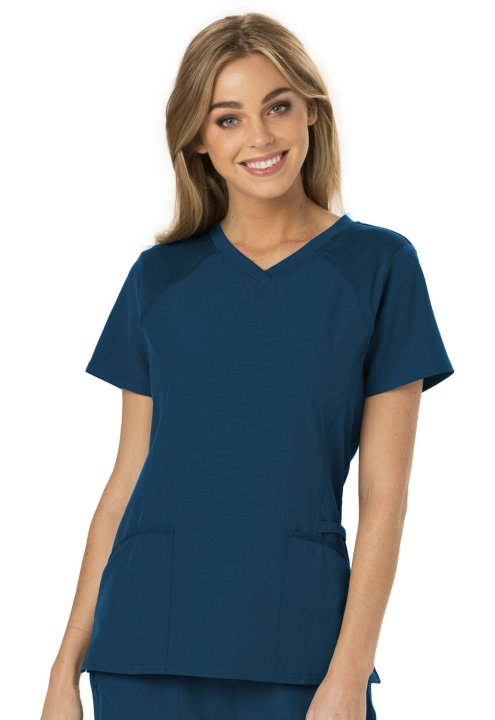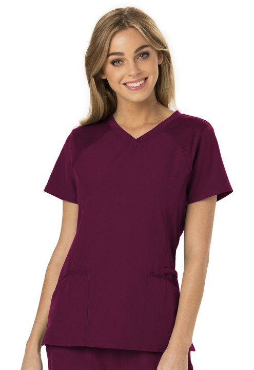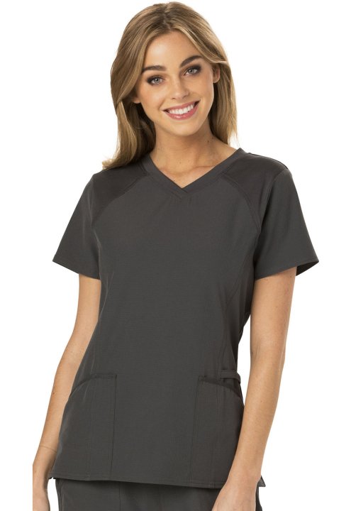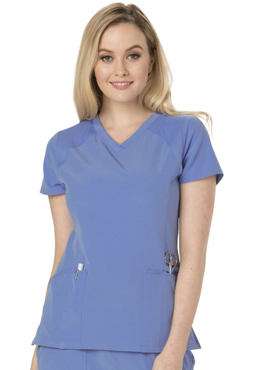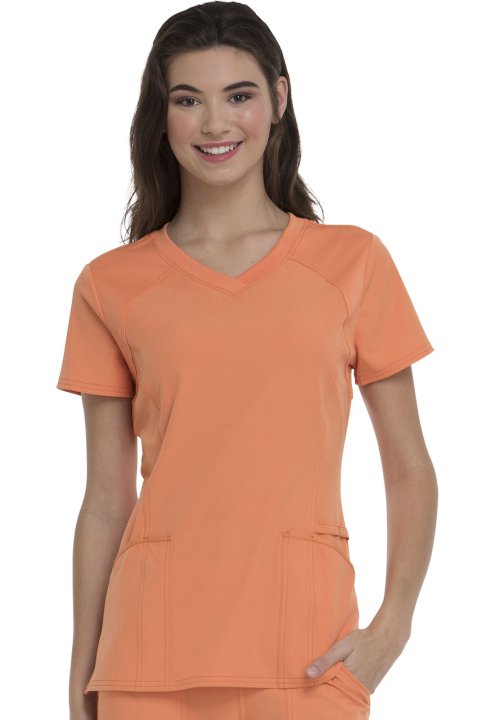 A Contemporary fit V-neck top features a rib-knit neckband and yokes, a signature triple-heart heat transfer and side vents with heart grommet detail. Also featured are rounded patch pockets (the right with an instrument loop), a hidden side pocket with a