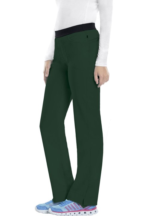 A low-rise, slim pant features a soft elastic waistband, front curved pockets and a mock fly. Also featured is a back yoke in stretch rib knit for added comfort, two back pockets and side vents. Cover-stitch detail throughout. Inseam length: 34"