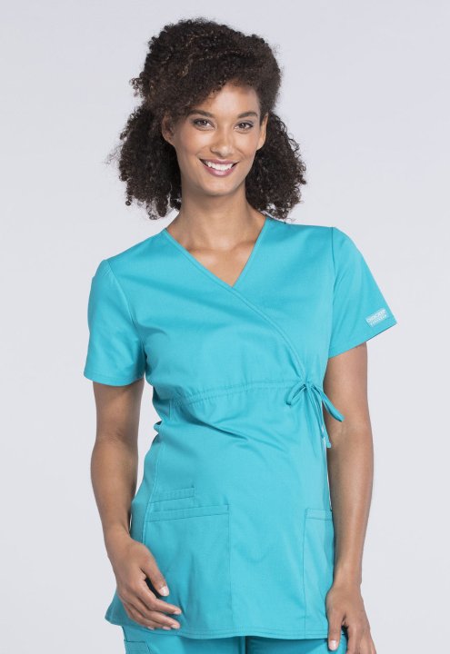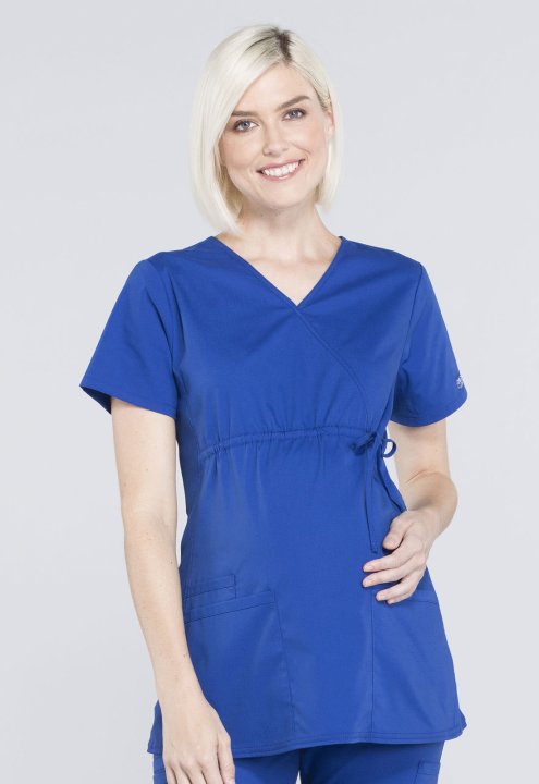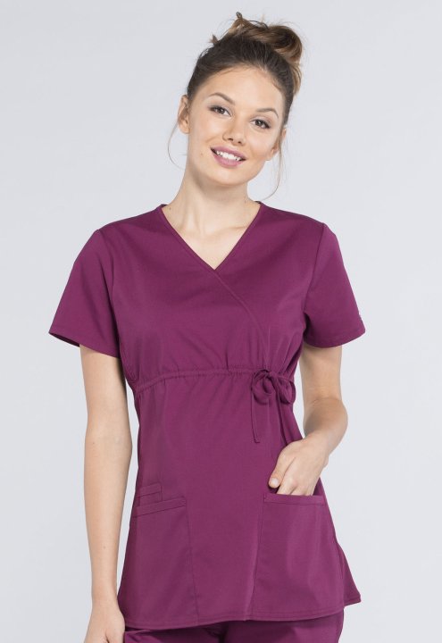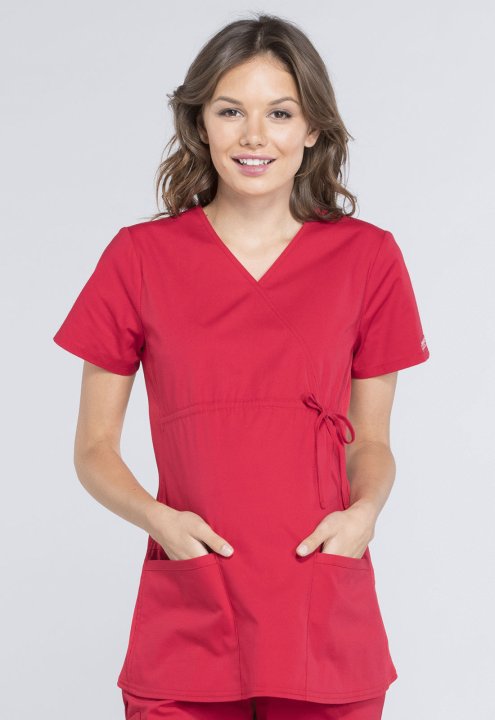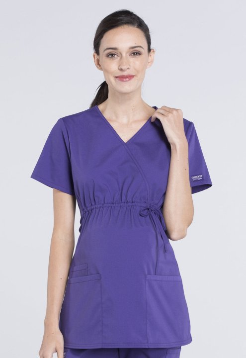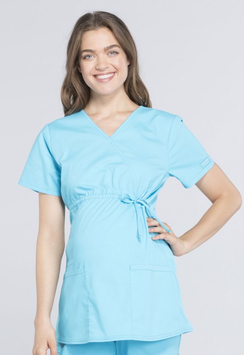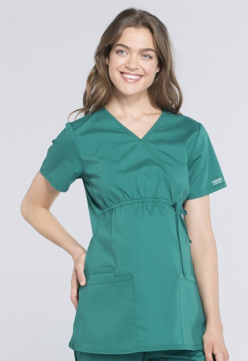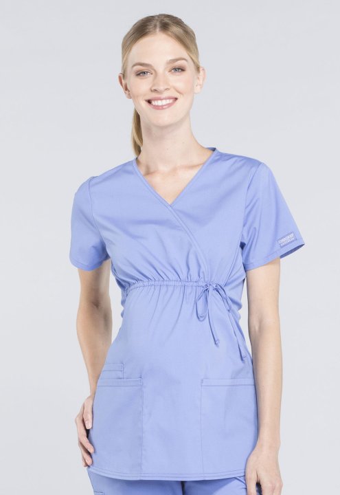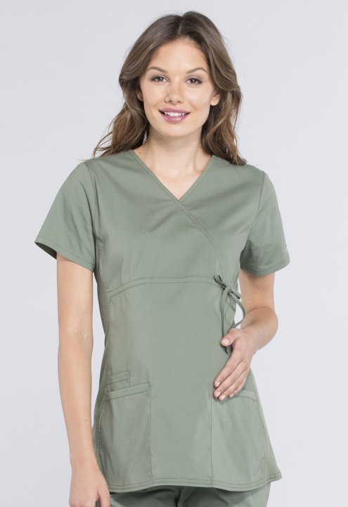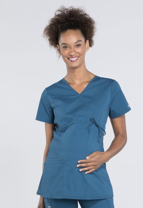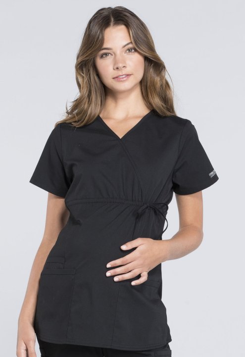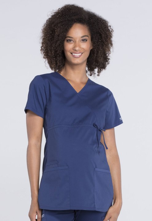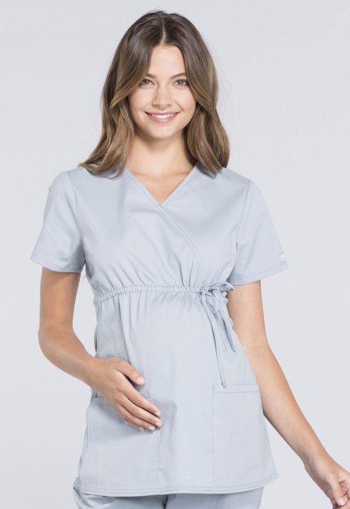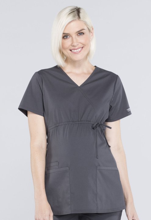 A Maternity mock wrap top features an empire waist with functional side-tie drawstring, and soft, stretchy rib knit side panels. Also featured are two patch pockets and a cellphone pocket. Our comfy Maternity styles are designed to support and flatter usi