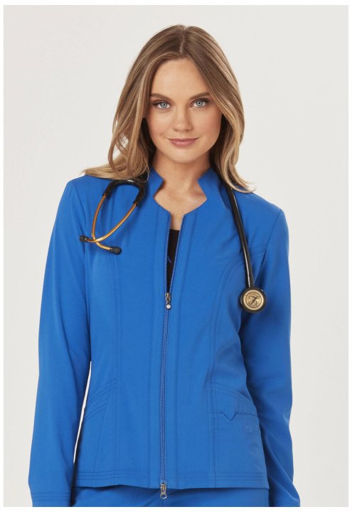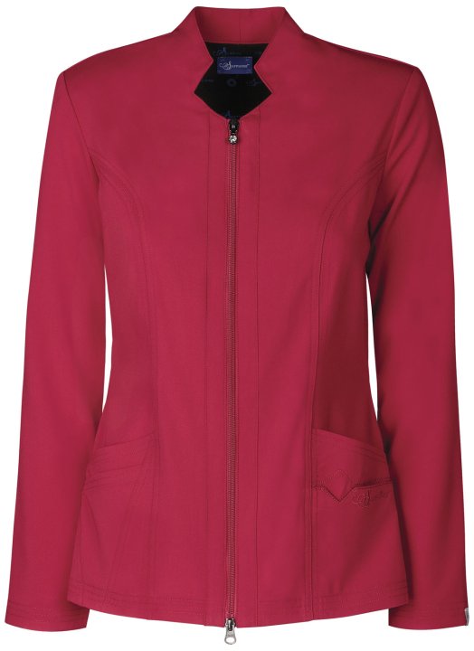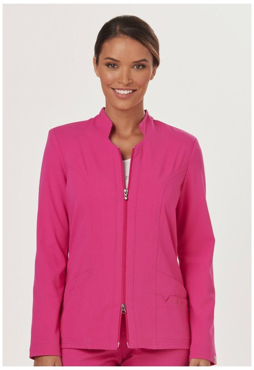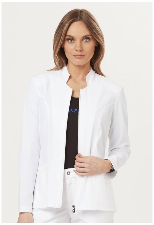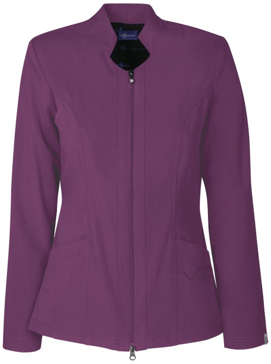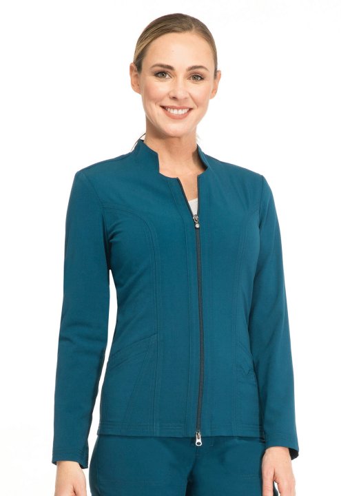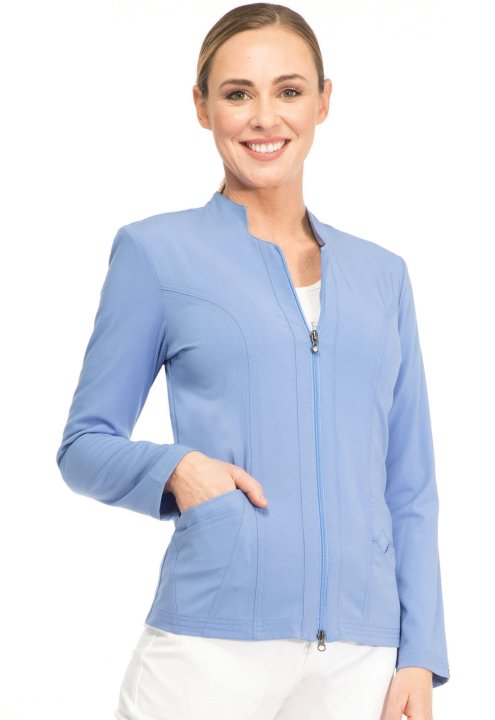 The Melrose inverted notched collar jacket offers a Contemporary fit. It features a two way zip front closure, front princess seams, 4 patch pockets, one with a tonal Sapphire logo embroidery finished with a diamond shape at the pocket hem, multi needle t