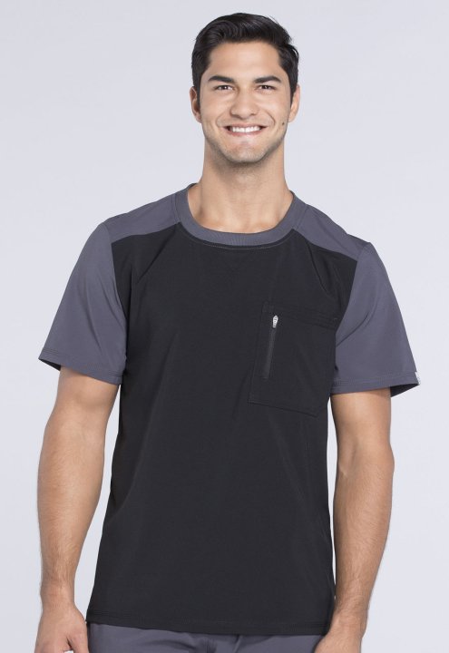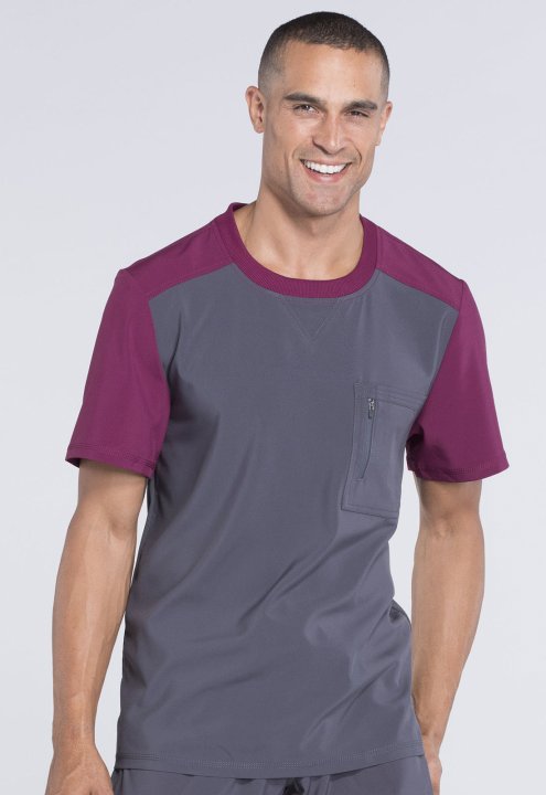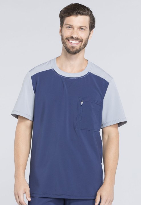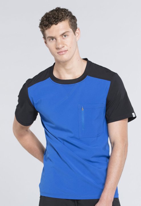 A Men's Athletic fit colorblock crew neck top features a chest pocket with zip closure for security, front and back yokes with triple-needle topstitching, and stretch rib knit neckband and back panels for extra comfort. Center back length: 29 1/2"
