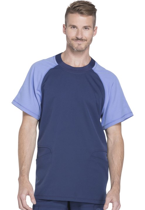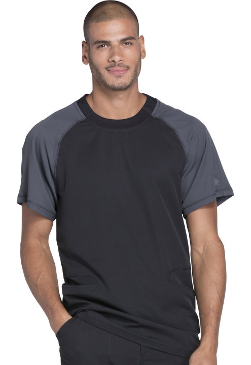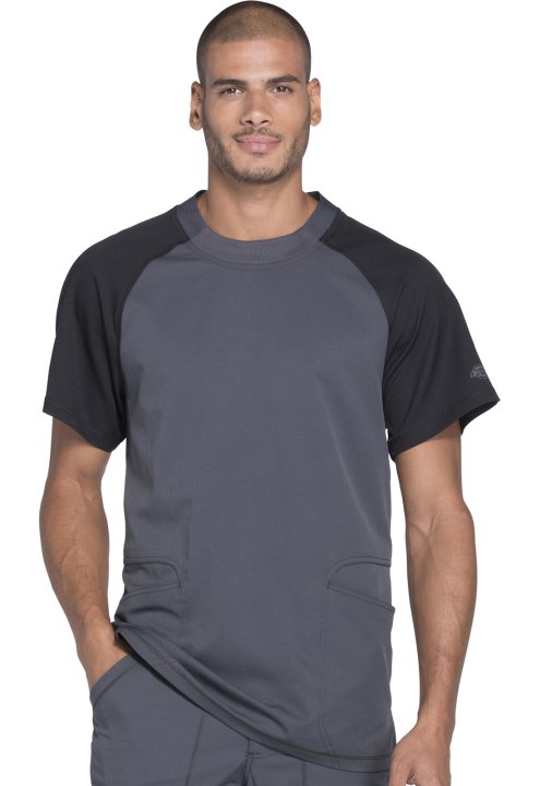 A Men's crew neck top features contrast raglan sleeves, and front slash pockets with double-needle topstitching (the right with a hidden grommet). Also featured are a signature tonal heat-transfer logo, side vents and coverstitch detail throughout. Center