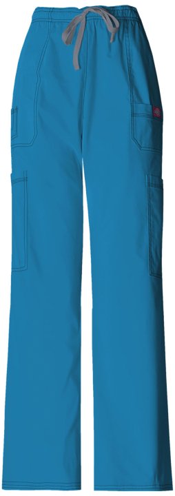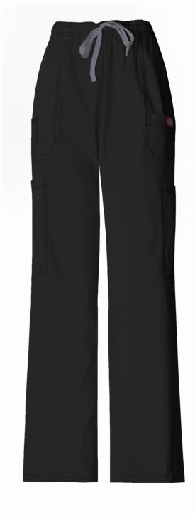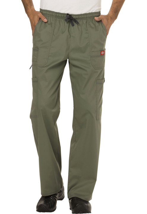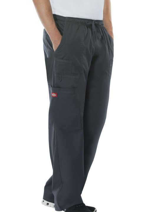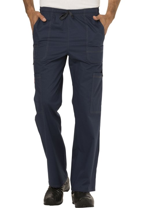 Mens Fit natural rise pant has an elastic waist with a web drawstring. Featured are two front patch pockets, the right pocket has an exterior triple pen holder with a bungee loop,while the left pocket has an additional cell phone pocket. Two cargo pockets