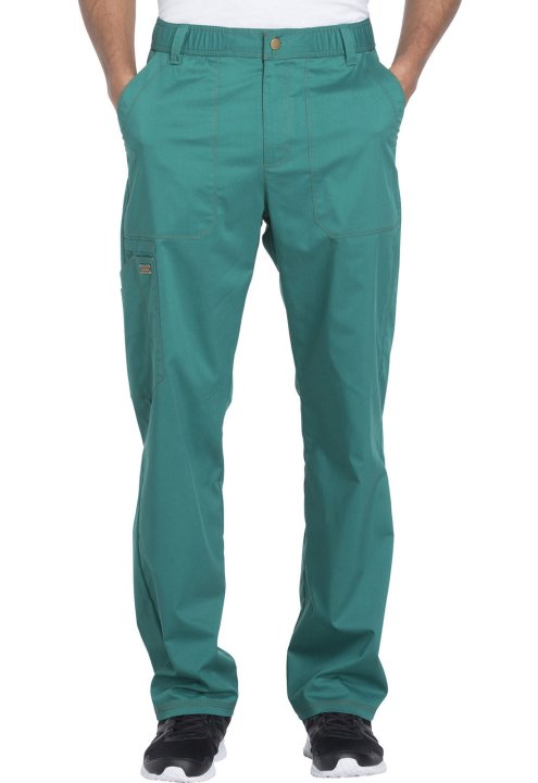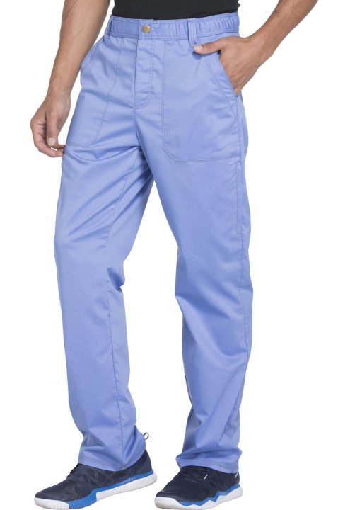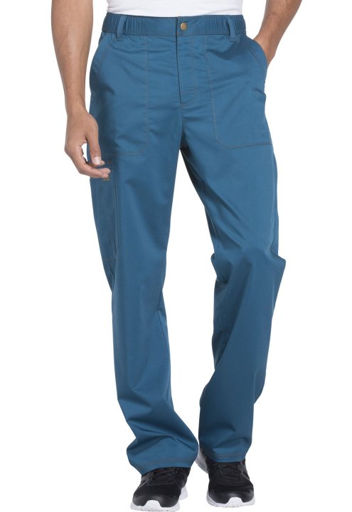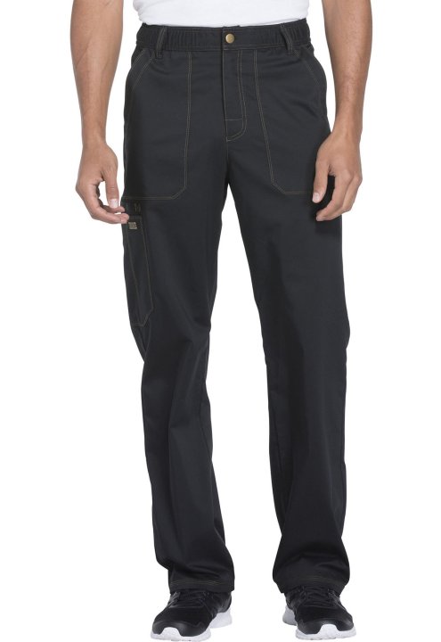 A Men's straight leg pant features a functional drawstring, zip fly with button closure, belt loops, deep front patch pockets, a right cargo pocket with extra scissor pockets and back patch pockets. Also featured are twill-tape utility loops, a hidden sid