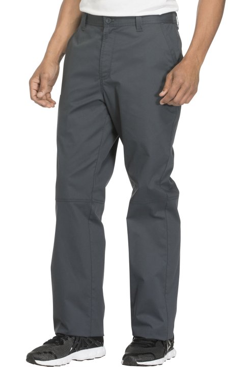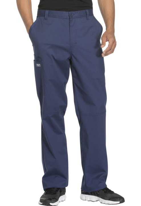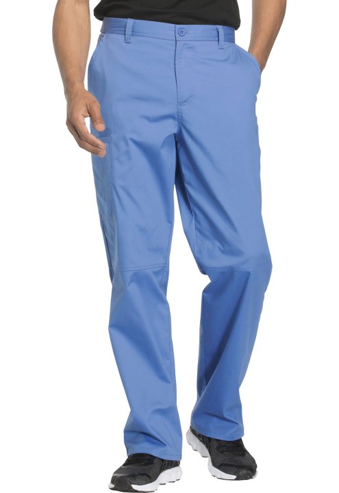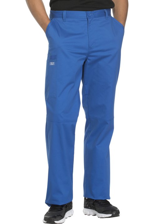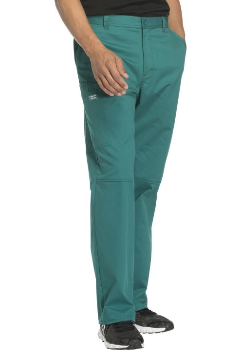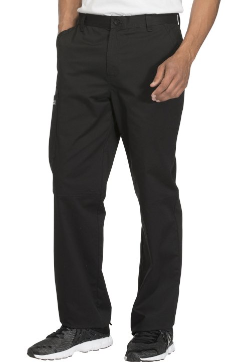 A Mens tapered leg pant features an inside functional drawstring, back elastic waistband, five belt loops, and a zip fly with button closure. Also featured are two front slash pockets, a right cargo pocket, a cell phone pocket with instrument loop, two ba