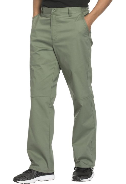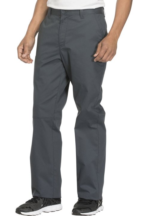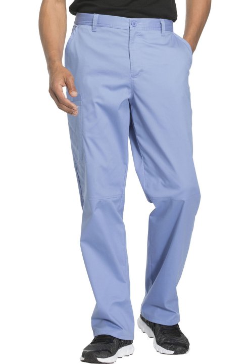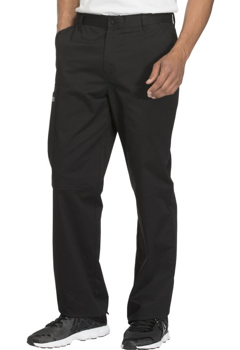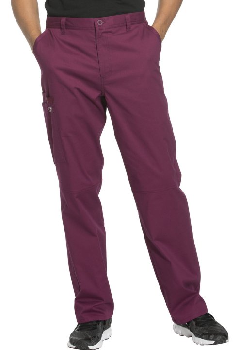 A Mens tapered leg pant features a back elastic waistband, functional inside drawstring, five belt loops and a zip fly with button closure. Also featured are two front slash pockets, a right cargo pocket, cellphone pocket with instrument loop, two back pa