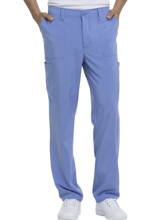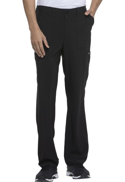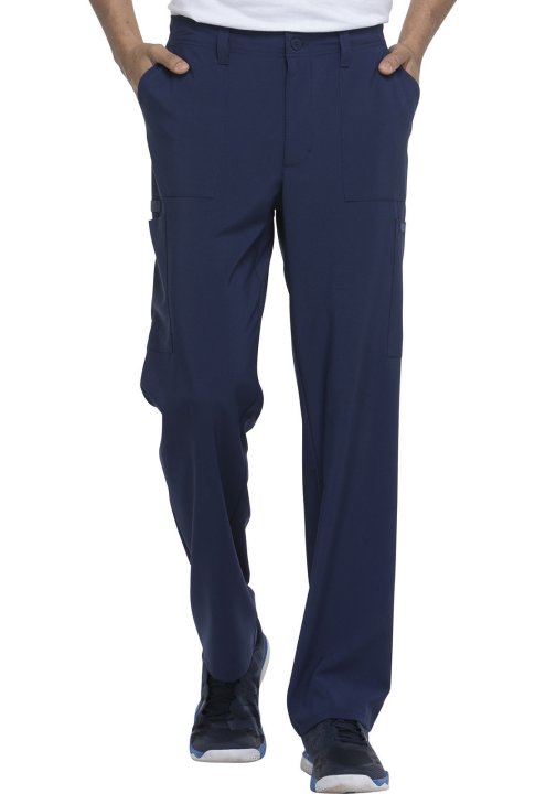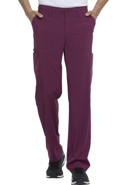 A Men's fit zip fly pull-on pant features an all around elastic waistband with a button closure, functional inside drawstring, multiple belt loops and six pockets. Two front patch pockets, two cargo pockets, and two back pockets. Also featured is a signat