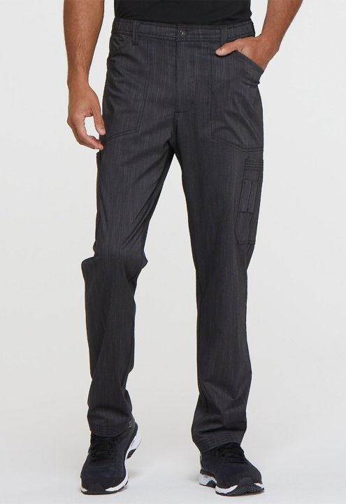 This men's straight leg pant features pull-on styling, with a natural rise, an elastic waistband with a functional drawstring, and a zip fly with a tack button closure. Additional design details include two front slash pockets, two back pockets, two cargo