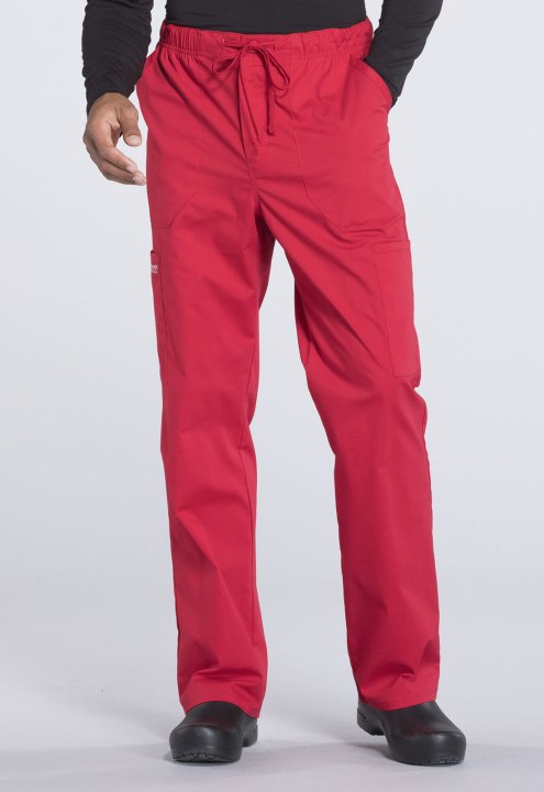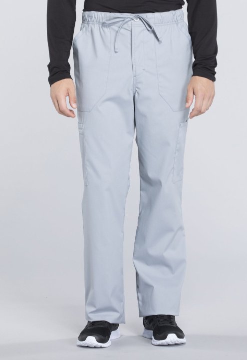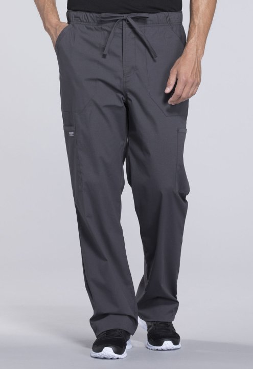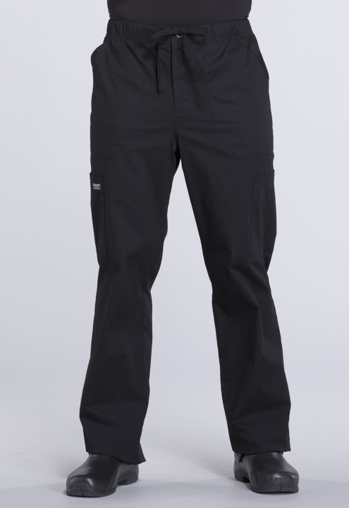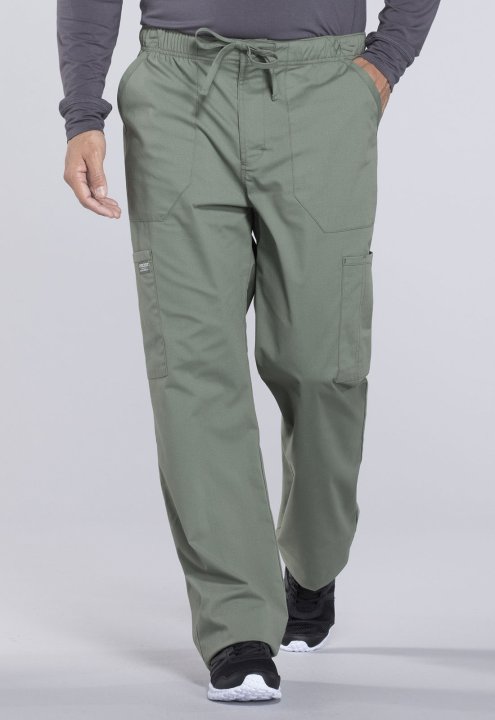 A Mens tapered leg pant with a functional drawstring and elastic waistband features a zip fly with button closure, front patch pockets, two cargo pockets and a back pocket. Inseam:32