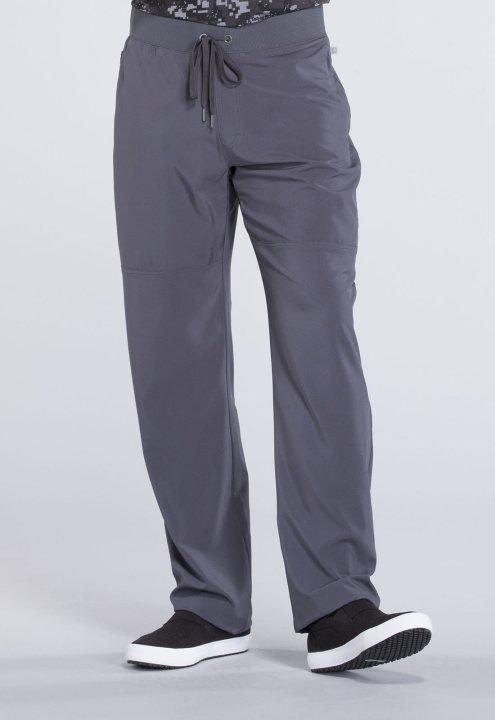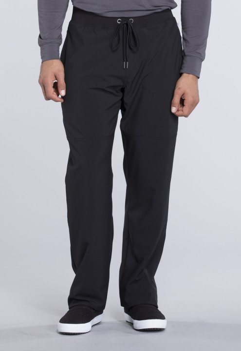 A Mens Athletic fit tapered leg pant features a rib knit all-around elastic waistband with functional drawstring, mock zip fly, side-seam zipper pockets, front knee-seam detail, a back zipper pocket and hidden inseam gusset for an easy fit. Inseam: 32"