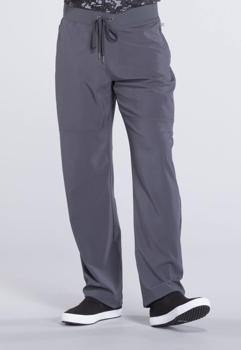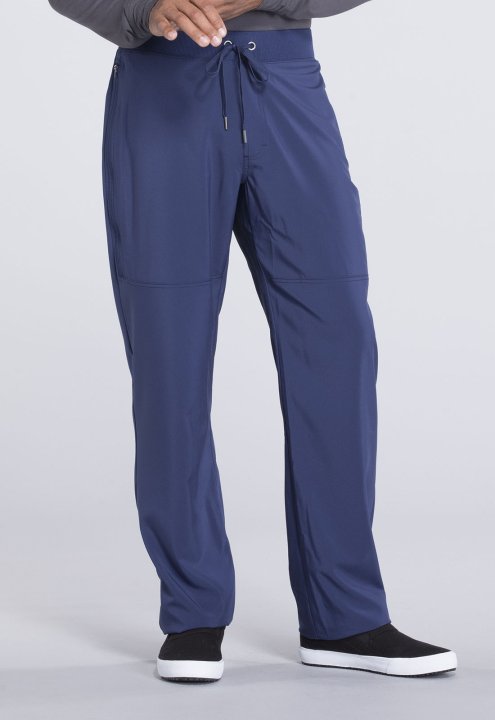 A Mens Athletic fit tapered leg pant features a rib knit all-around elastic waistband with functional drawstring, mock zip fly, side-seam zipper pockets, front knee-seam detail, a back zipper pocket and hidden inseam gusset for an easy fit. Inseam: 29 1/2