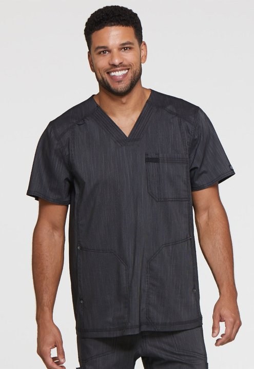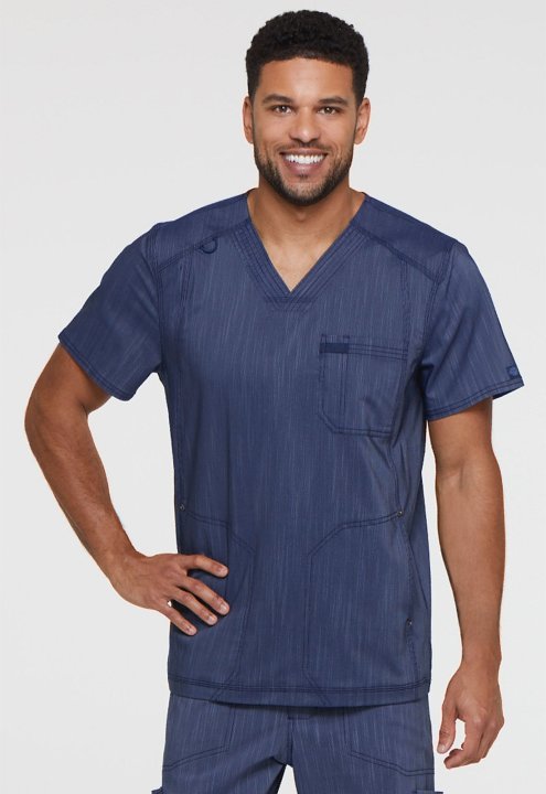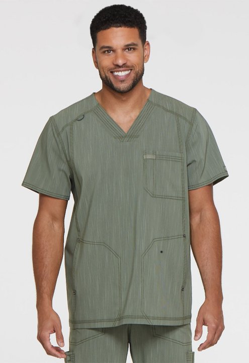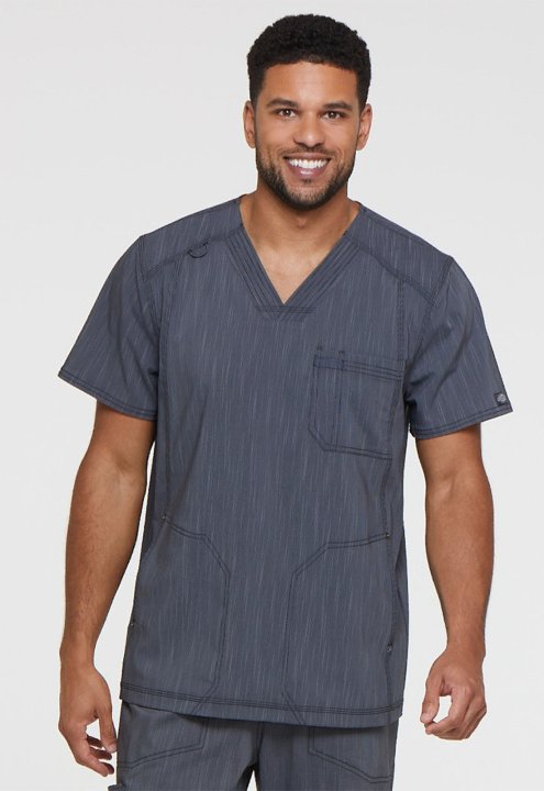 This mens V-neck top features a chest pocket with a pencil slot, two inseam pockets at the waist, and a dyed-to-match bungee at the wearer's right front shoulder yoke. Additional design details include heavy topstitching, Dickies logo rivets, and a Dickie