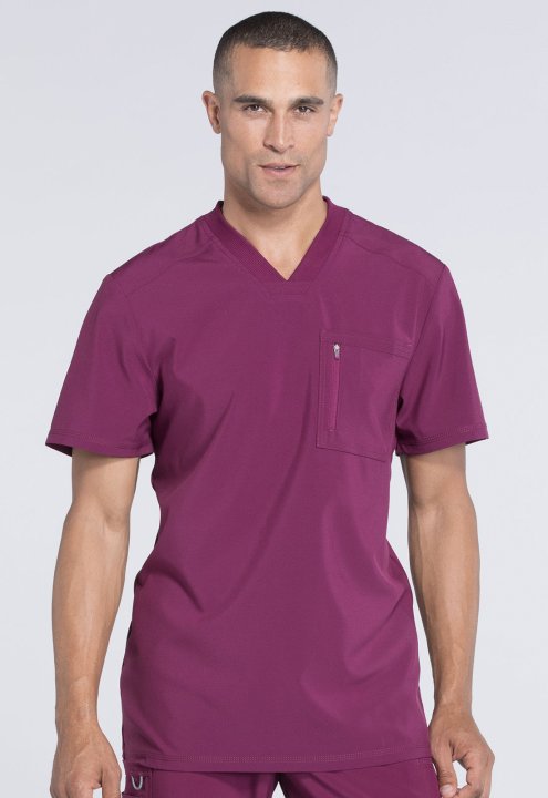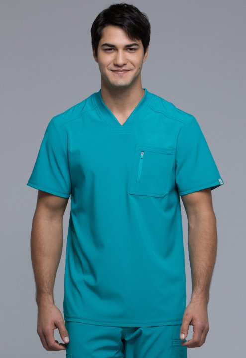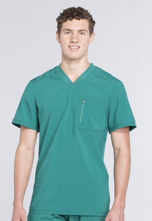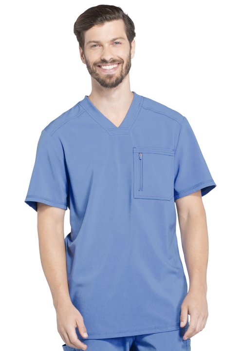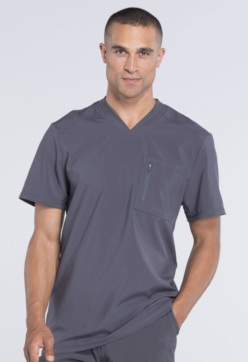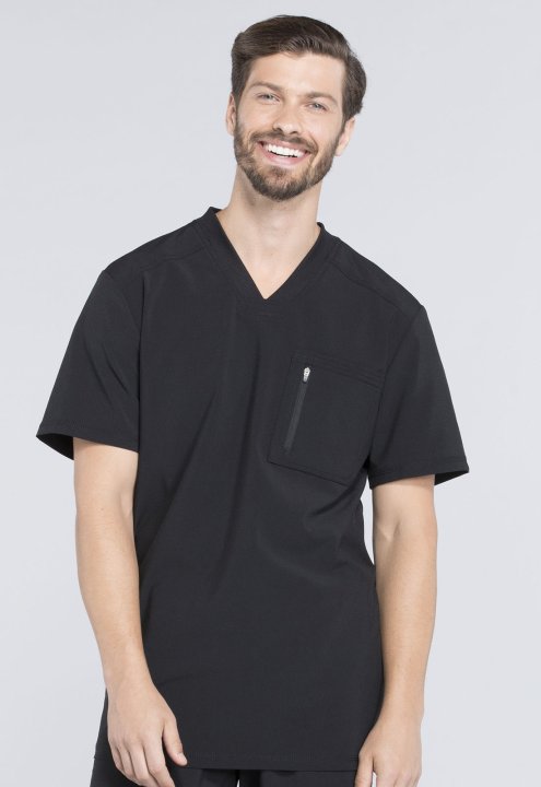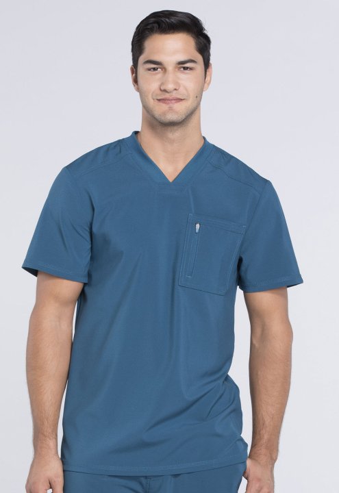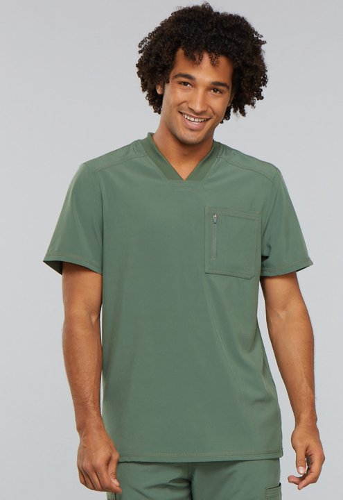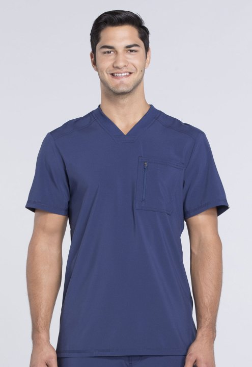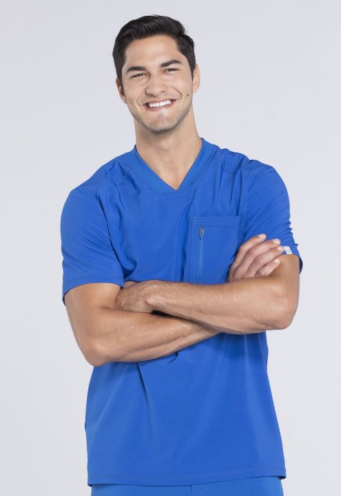 A Mens Athletic fit V-neck top features a chest pocket with zip closure for security, instrument loop on the left sleeve, front and back yokes with triple-needle topstitching, and stretch rib knit neckband and back panels for extra comfort. Center back le