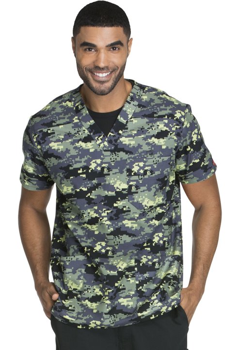 A Mens V-neck top features a double chest pocket with a pencil stitch and D-ring. Also featured are patch pockets, a back yoke, center back seam and side vents. Center back length: 29