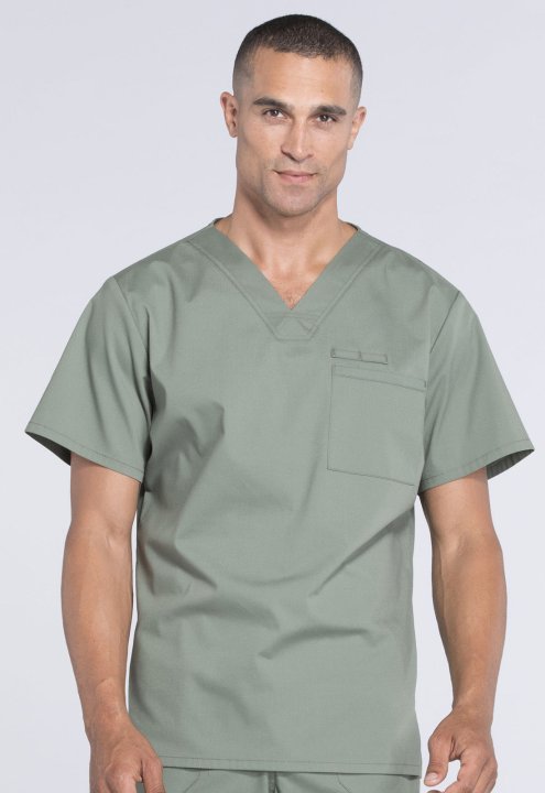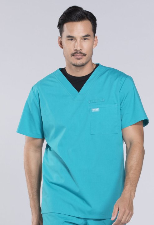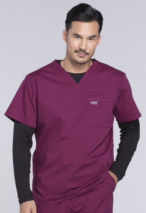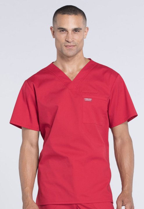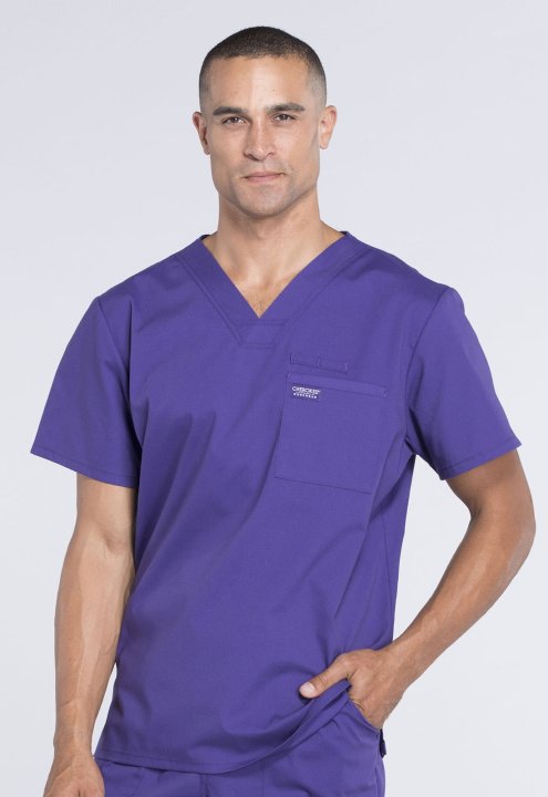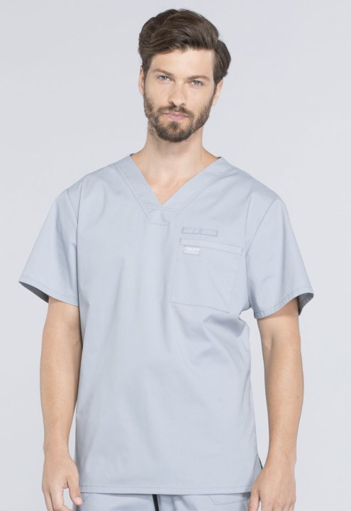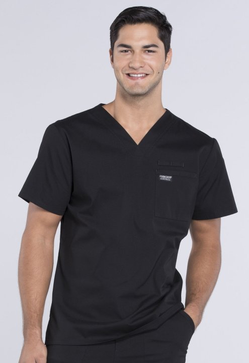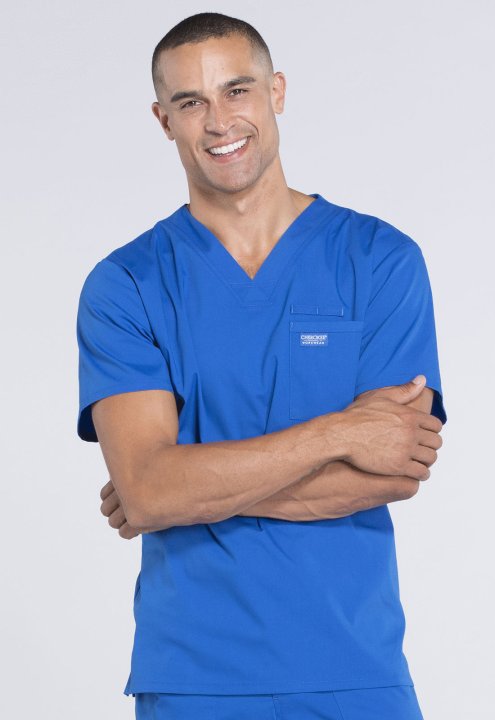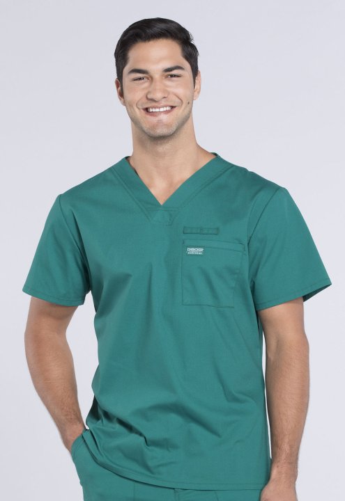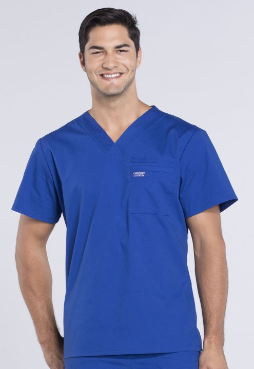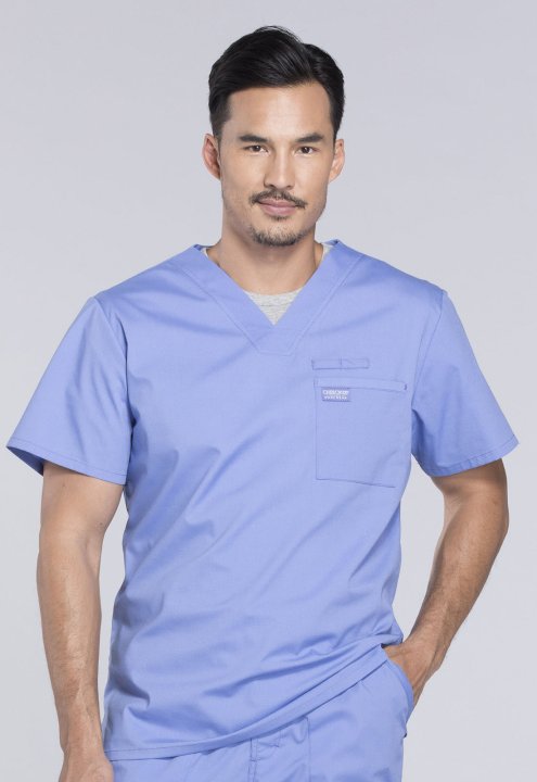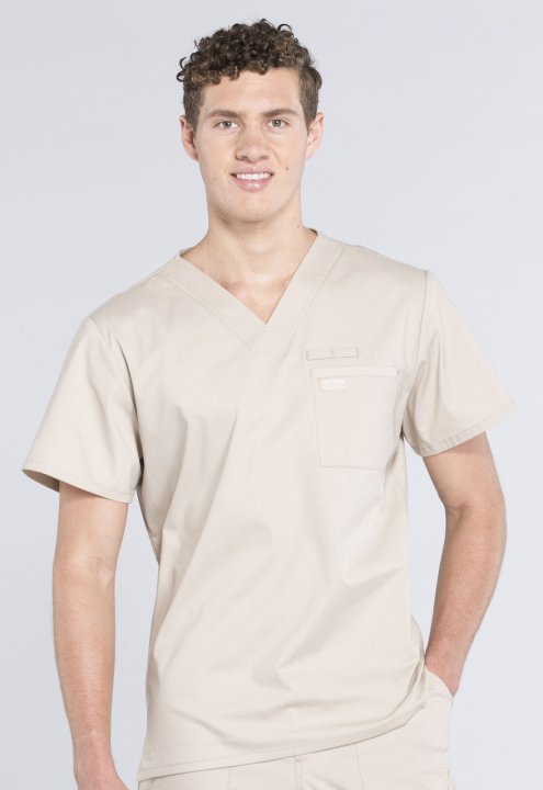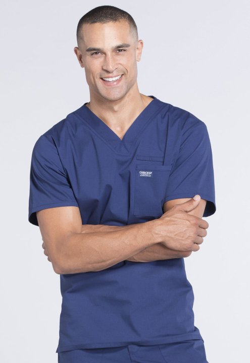 A Mens V-neck top features a chest pocket with instrument loop, a back yoke and side vents. Center back length:28