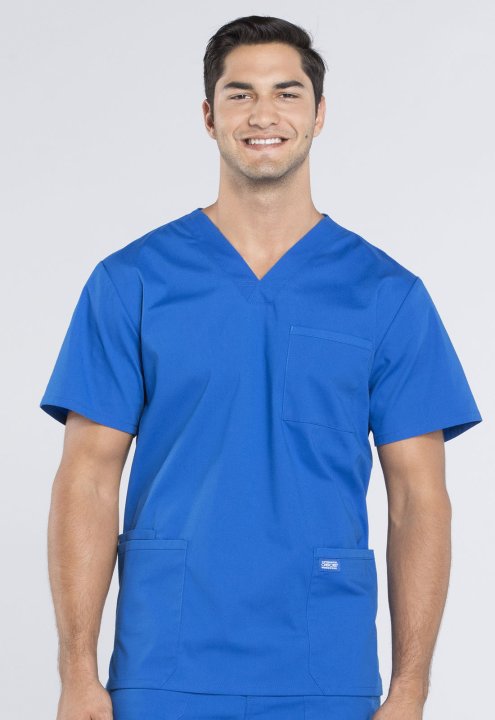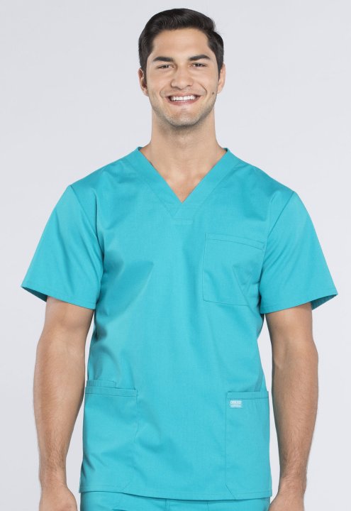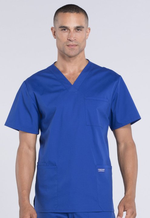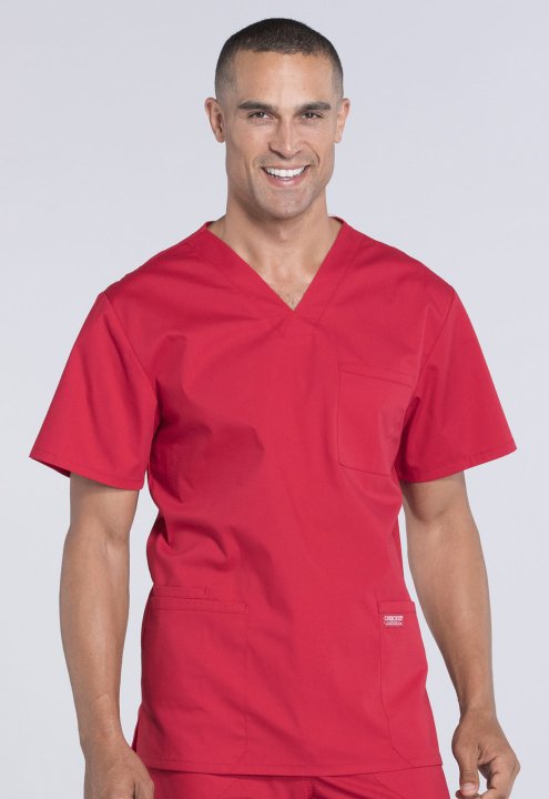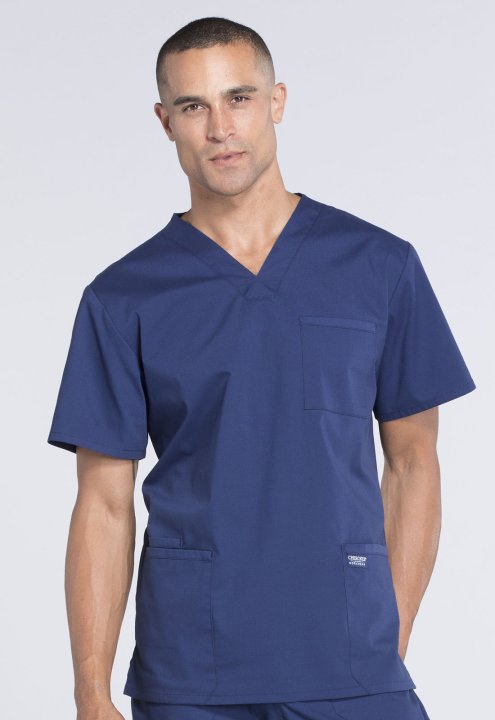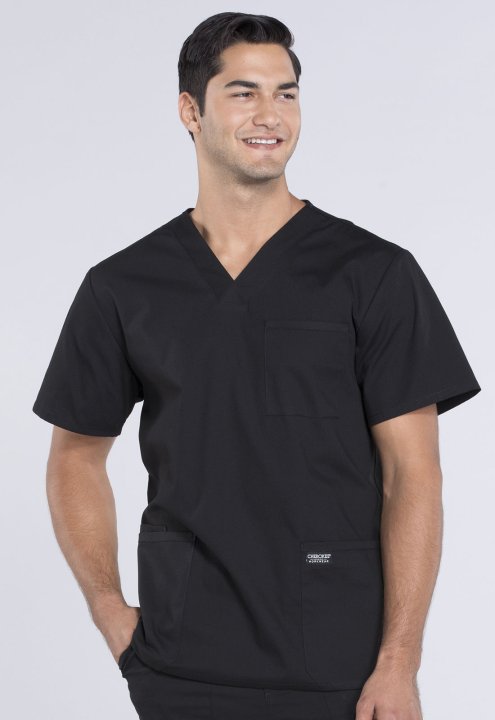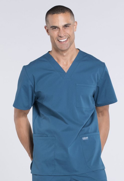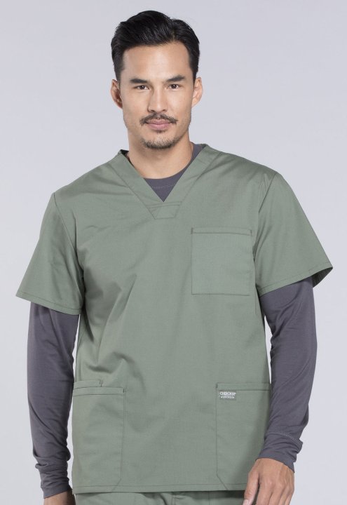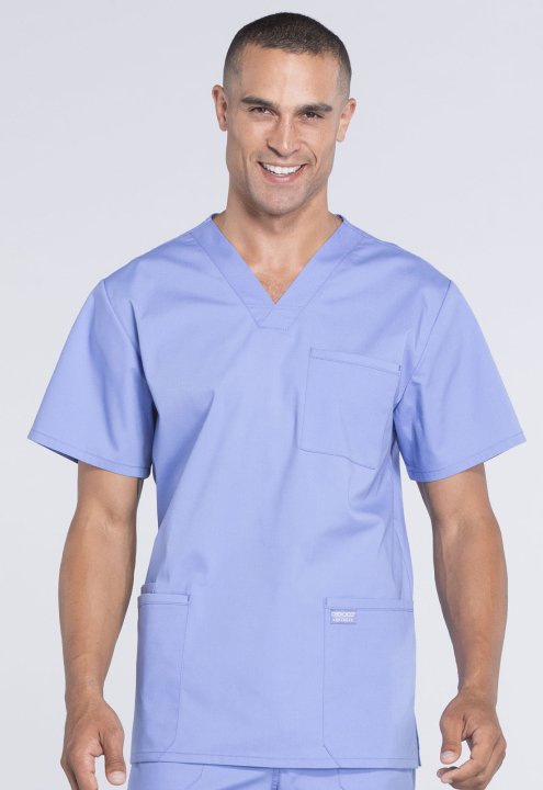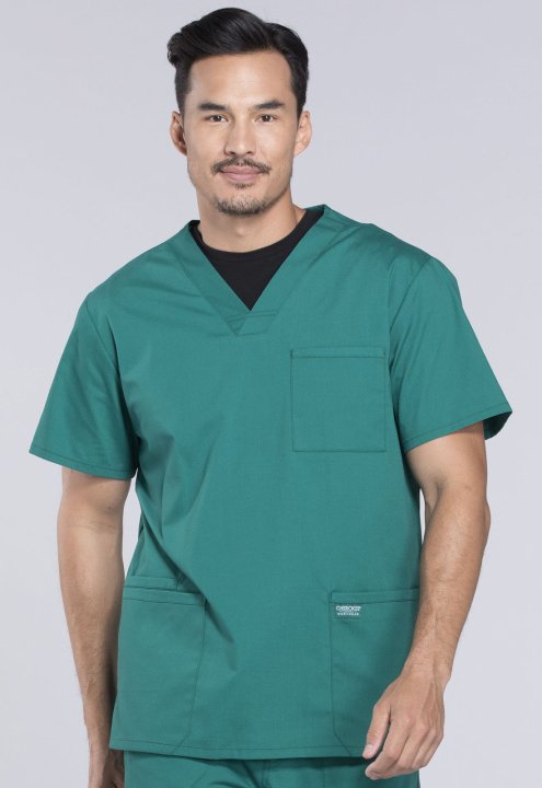 A Mens V-neck top features a chest pocket, two patch pockets, a cellphone pocket, a hidden instrument loop, back yoke and side vents. Center back length:29