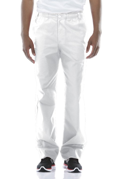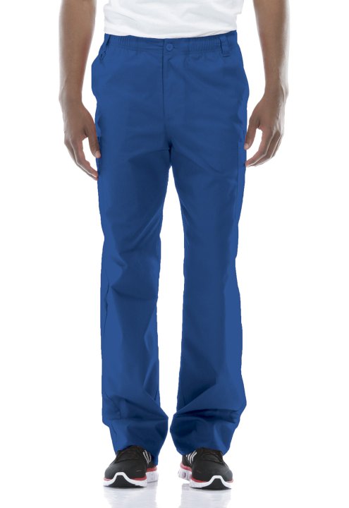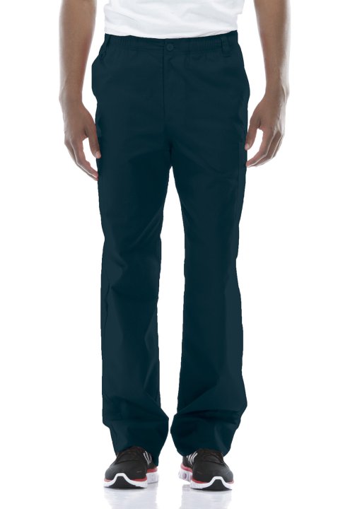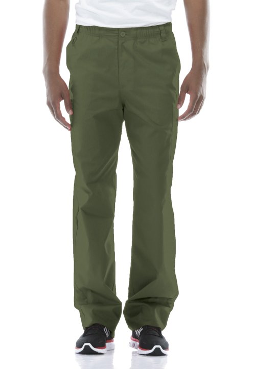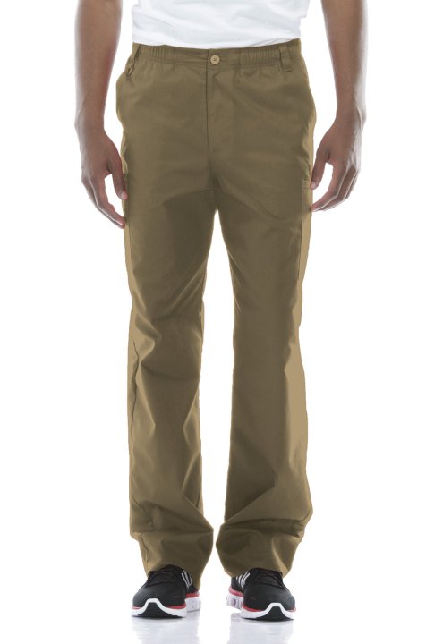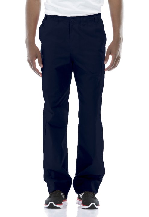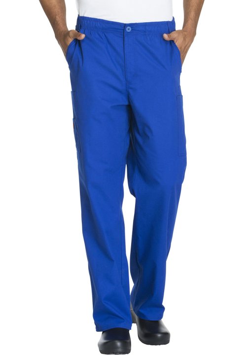 Mens zip fly pull-on pant features an all around elastic waistband with a button closure, an adjustable interior drawstring and Dickies logo twill tape on the inside back waistband. Also featured are slash pockets, cargo pockets and a back pocket with a h