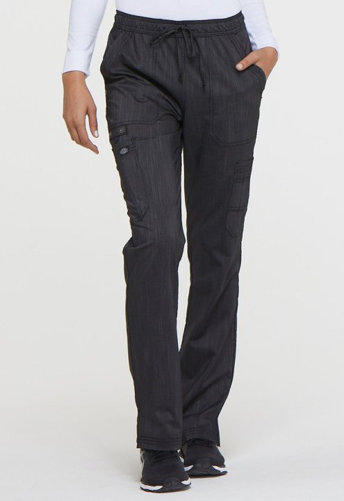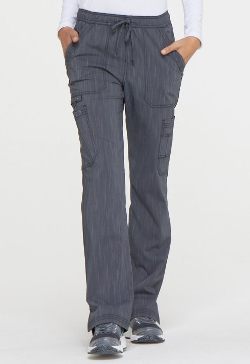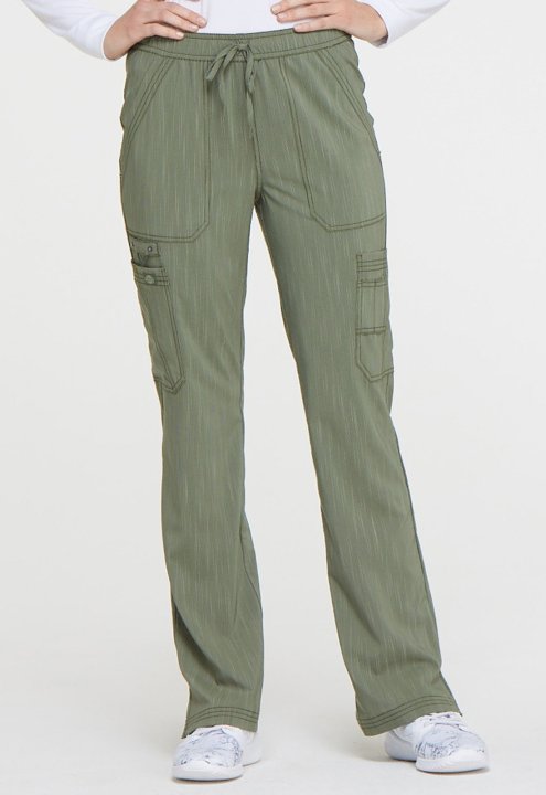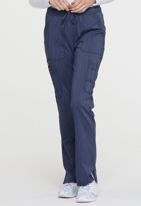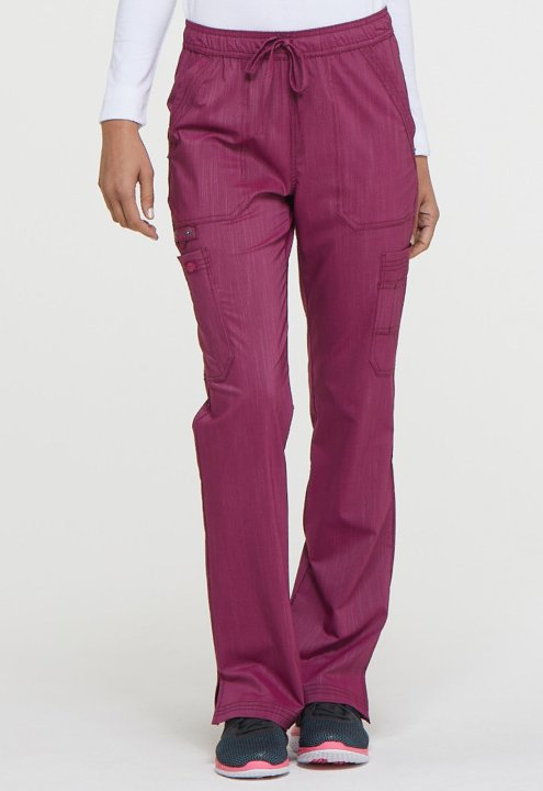 This mid rise boot cut pant features pull-on styling, with a functional drawstring and elastic waistband. Additional design details include two patch pockets, two cargo pockets, a scissor pocket, two back pockets, two self instrument loops, an instrument
