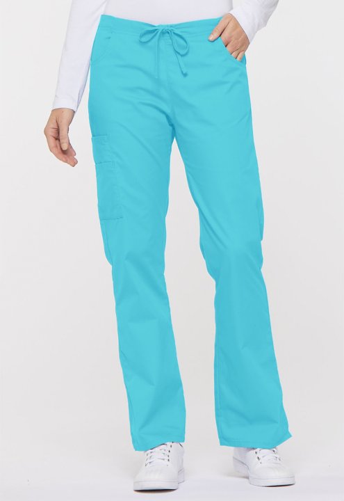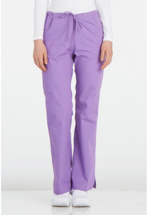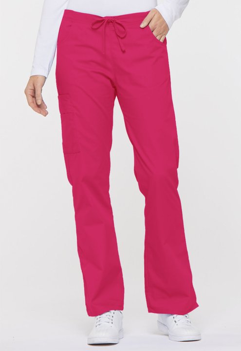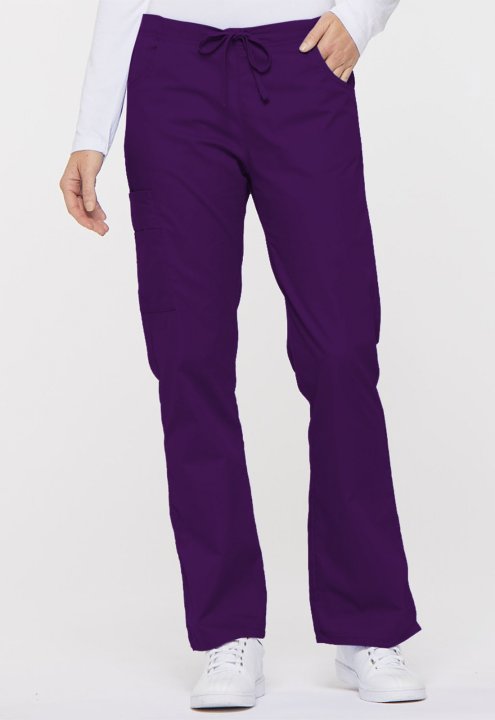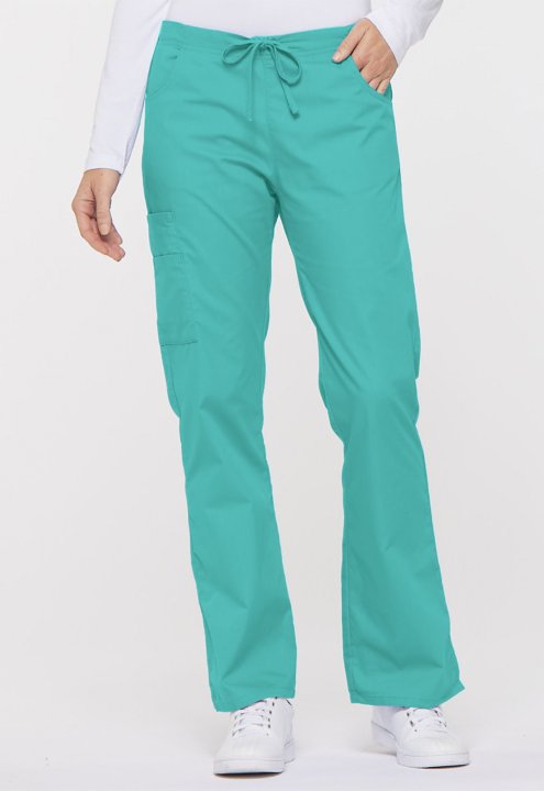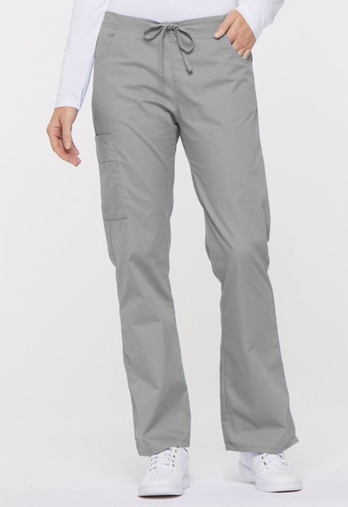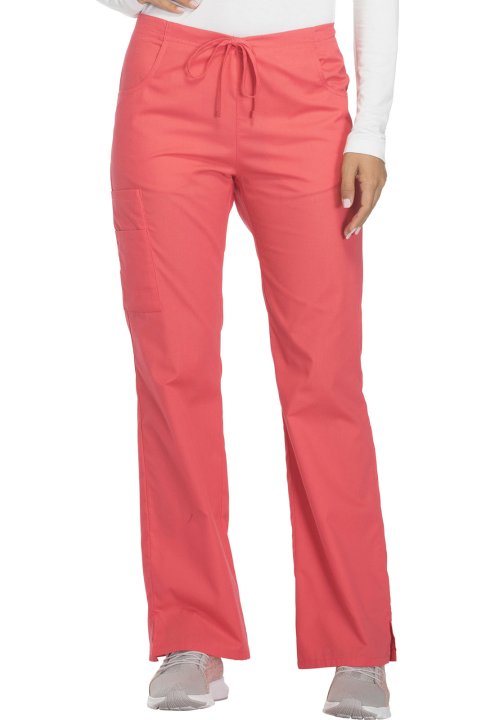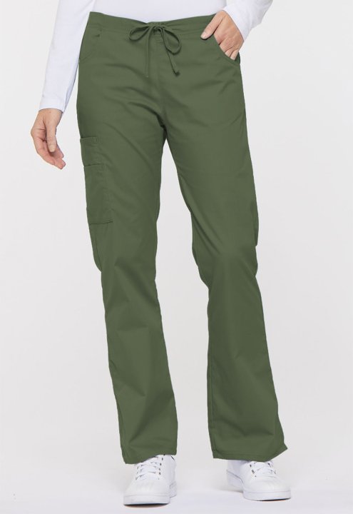 A Modern Classic fit, mid rise, moderate flare leg pant features an adjustable drawstring with elastic at the back waist and Dickies logo twill tape on the inside back waistband. Also featured are patch pockets, a back pocket, cargo pockets with a stretch