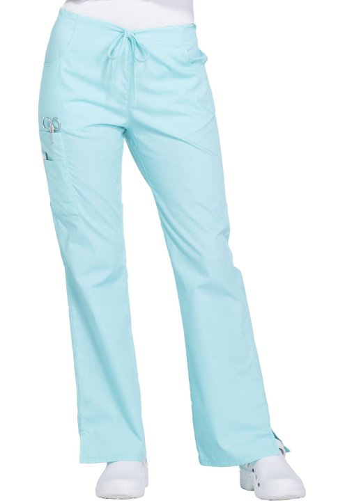 A Modern Classic fit, mid rise, moderate flare leg pant features an adjustable drawstring with elastic at the back waist and Dickies logo twill tape on the inside back waistband. Also featured are patch pockets, a back pocket, cargo pockets with a stretch