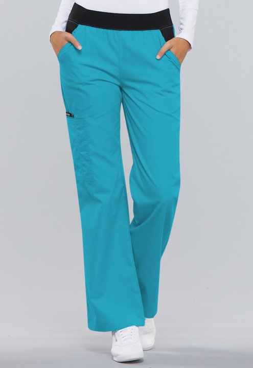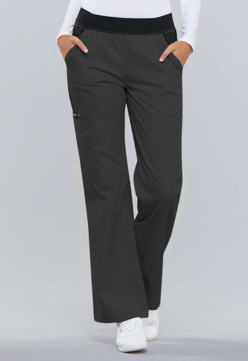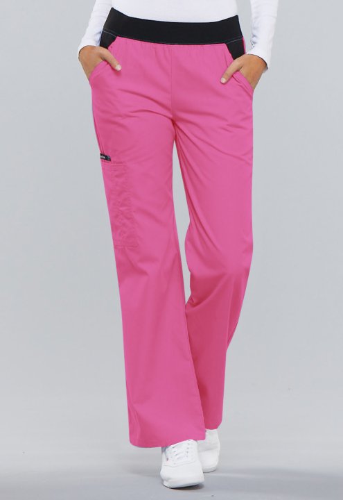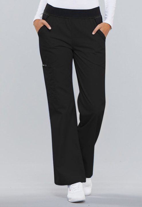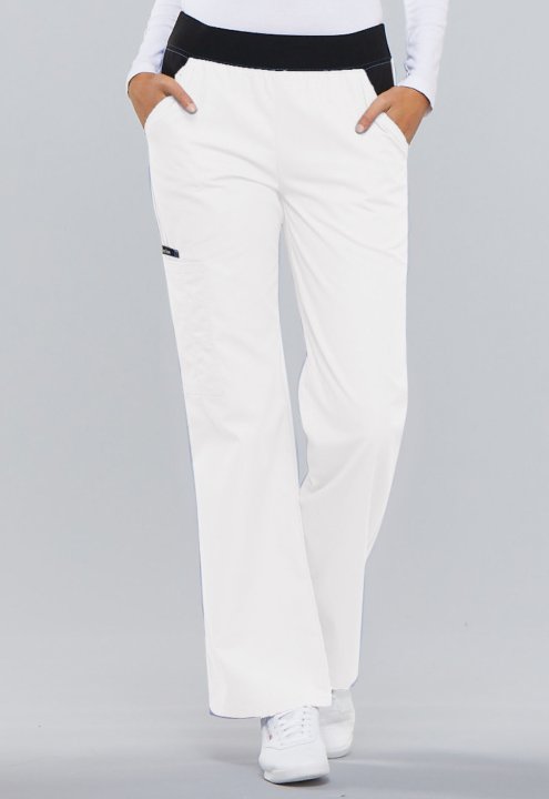 A Modern Classic fit, mid rise, moderate flare leg pant features a "Comfort Fit" knit spandex waistband reinforced with inside elastic for extra support and elasticity. Also featured are contrast slash pockets, a cargo pocket with a stitched down pen slot